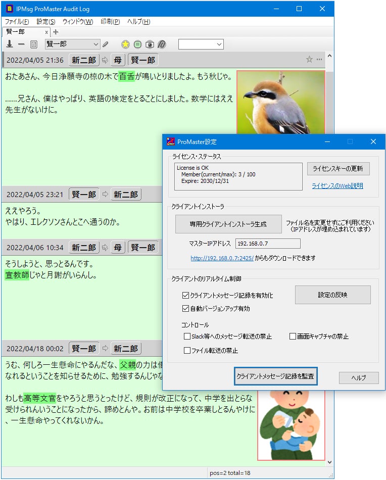 「IP Messenger Pro」は、企業様よりご要望の多かった「ログ監査機能」や「メッセージ外部転送の許可/禁止」などの各種コンプライアンス機能を搭載した、年間170万ダウンロードを誇る「IP Messenger」の商用版です。また設定不要な専用インストーラ生成機能など、管理コスト低減機能も搭載しております。