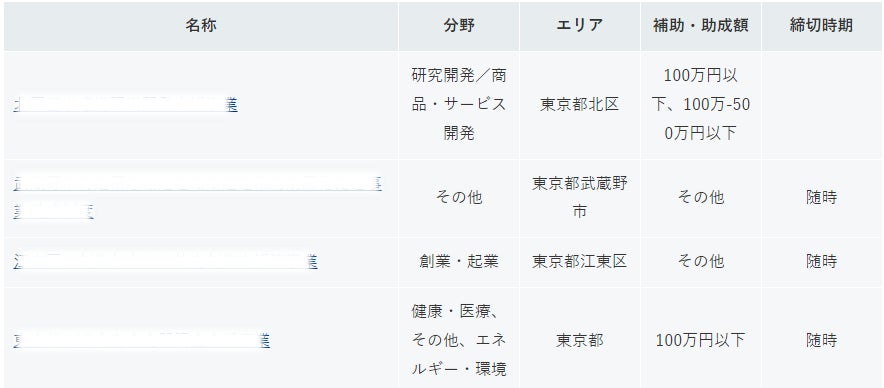 検索条件に合致する助成金・補助金の情報が一覧で表示されます。