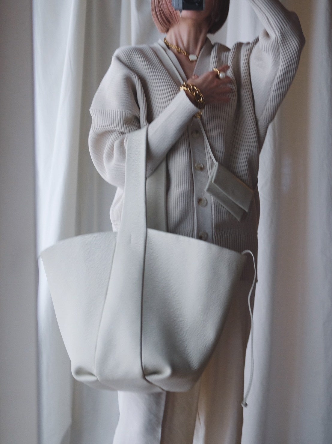 クラッチバッグのように二つ折りにして持てたり、紐を結んでバケツトートのように持てたりと