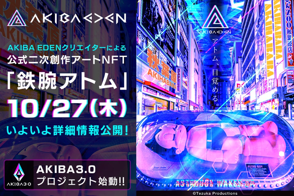 “AJAオフィシャルNFTマーケットプレイス”の幕開け第1弾として、AJA正会員の株式会社手塚プロダクションと“AKIBA EDEN”(合同会社AKIBA観光協議会と株式会社カヤックアキバスタジオが運営する次世代型クリエイターネットワーク)とのコラボレーションによる“鉄腕アトム”の二次創作コンテンツのNFT販売を計画しています。