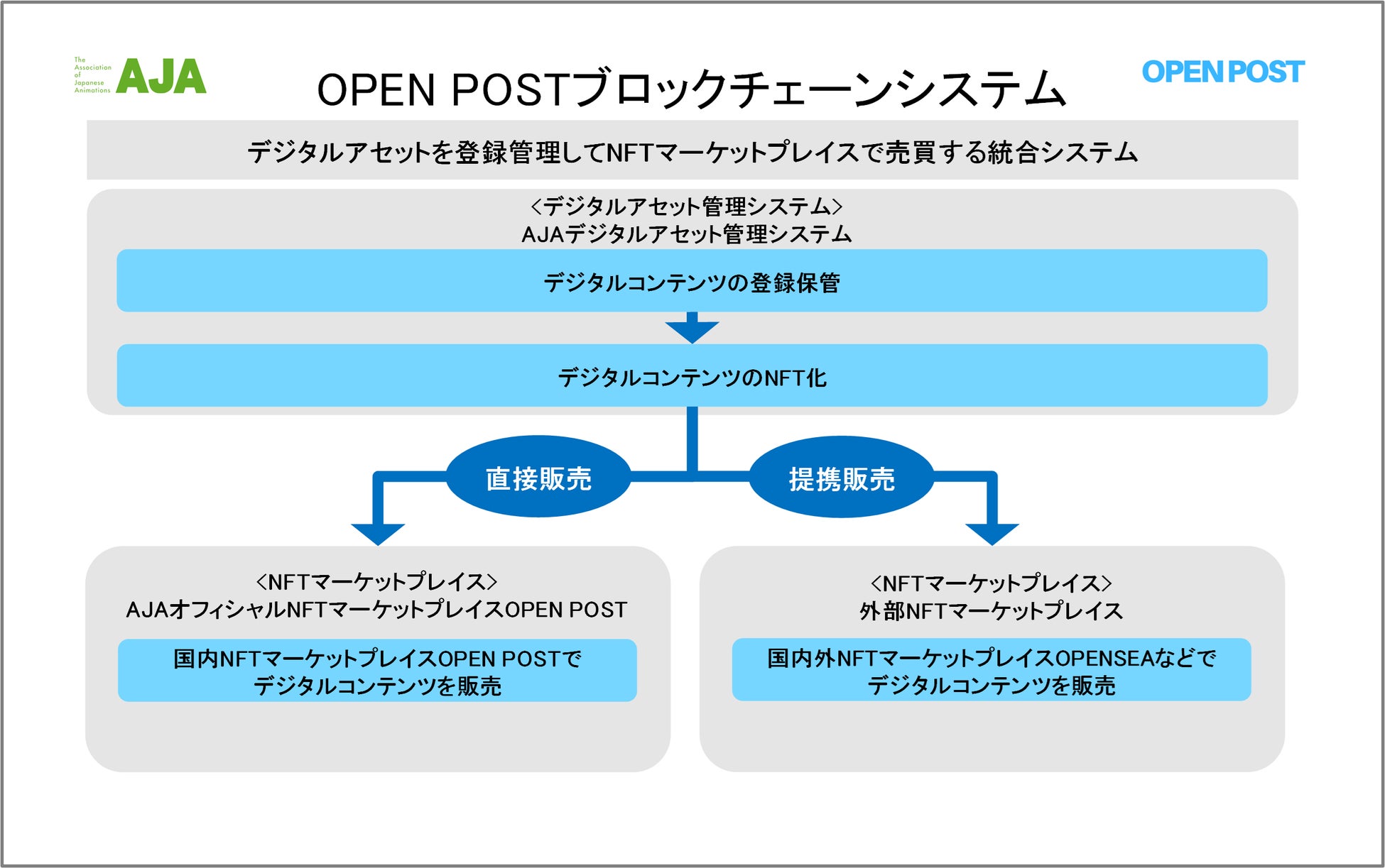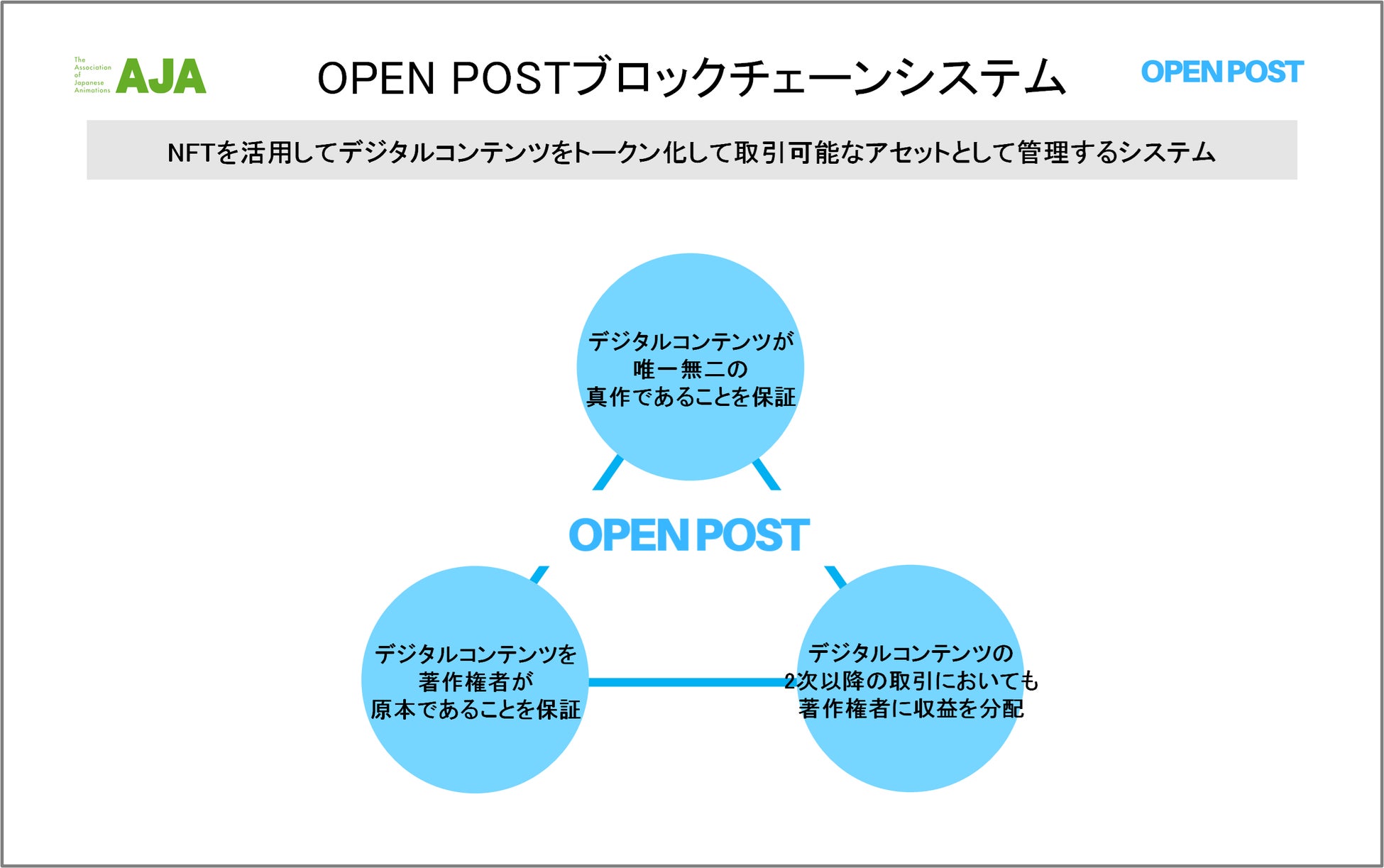 オープンポスト合同会社(以下OPEN POST、代表社員 小泉満)は、一般社団法人日本動画協会((以下AJA、理事長 石川和子)の公認を受けてブロックチェーンシステムを採用した“AJAデジタルアセット管理システム”及びに“AJAオフィシャルNFTマーケットプレイスOPEN POST” ( https://www.openpost.co.jp/ )を2022年年内にオープンします。今後オープンに向けた情報を順次お伝えしていきます。