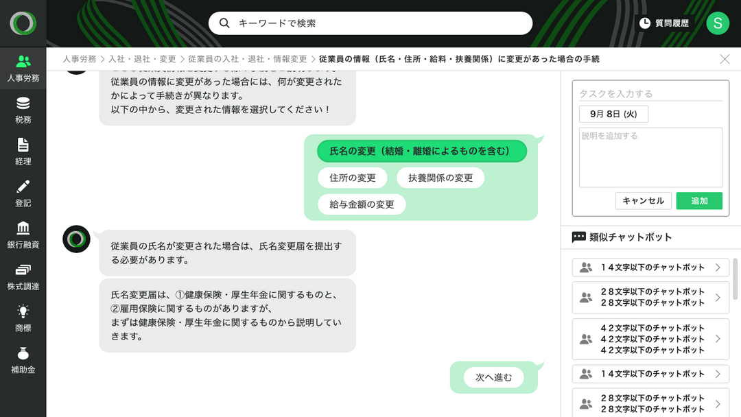 税務・労務・経理・登記などを始め、様々な分野のバックオフィス業務をチャットボットがいつでもサポート。