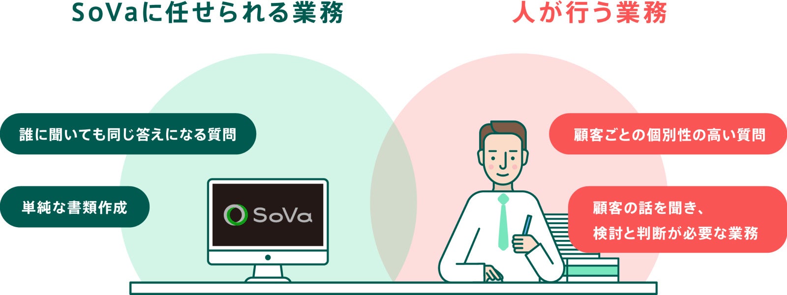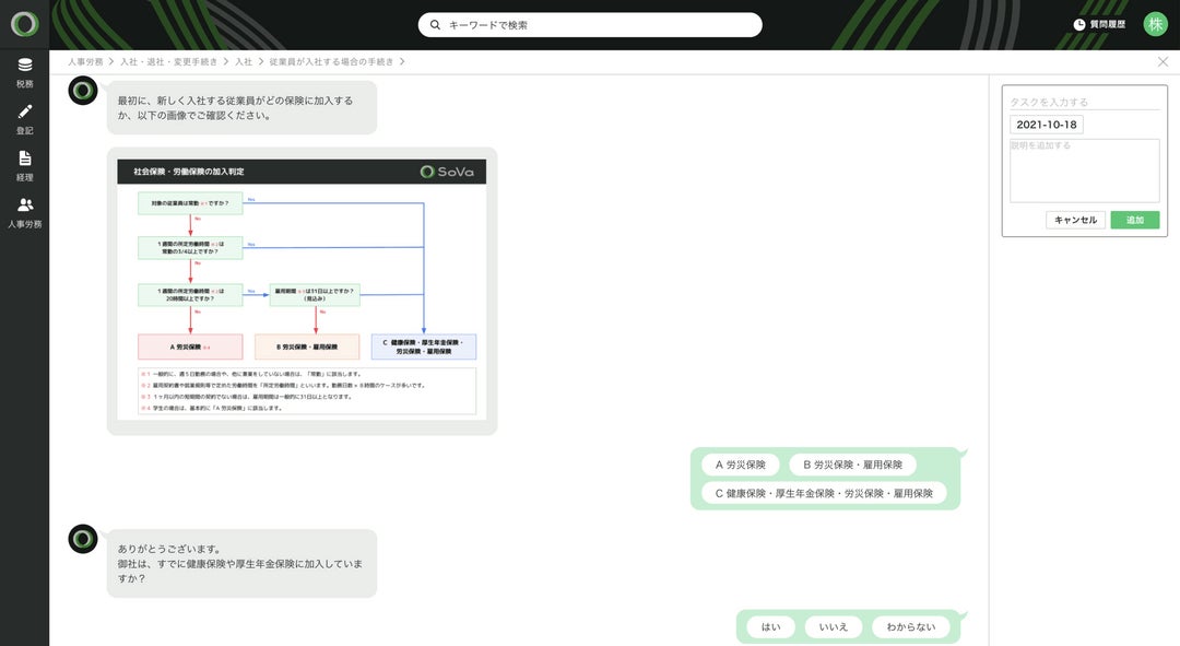 バックオフィス支援サービス「SoVa」は、これまで税理士、社労士、司法書士などの専門家が属人的に有していた知識やノウハウをデータベース化し、ユーザーの状況に合わせて必要な情報をチャットボット形式で伝えるサービスです。