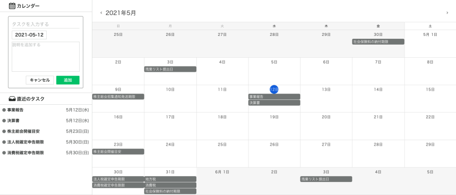 法律等で決まっているタスクは自動で反映済み。会社ごとのタスクは自由に追加することが可能。