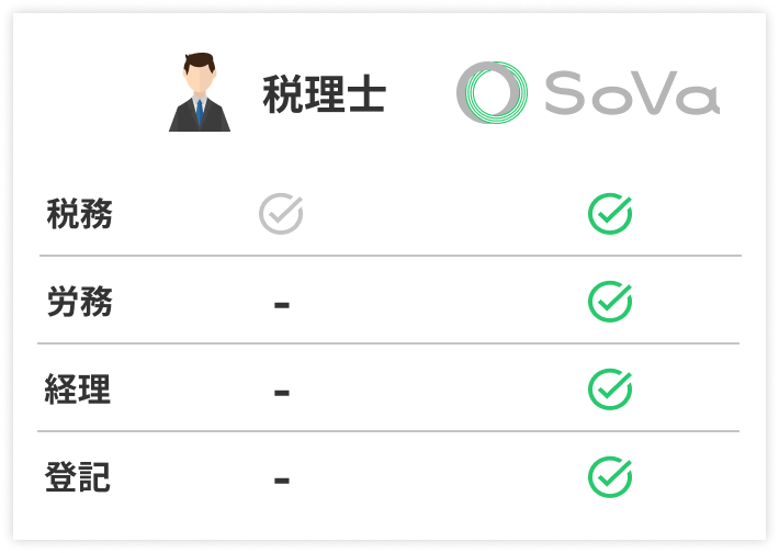 税務のみの対応が多い税理士に対して、SoVaは労務や経理、登記をはじめとする幅広い分野で会社のバックオフィス業務をサポート。これひとつでバックオフィス業務は安心。