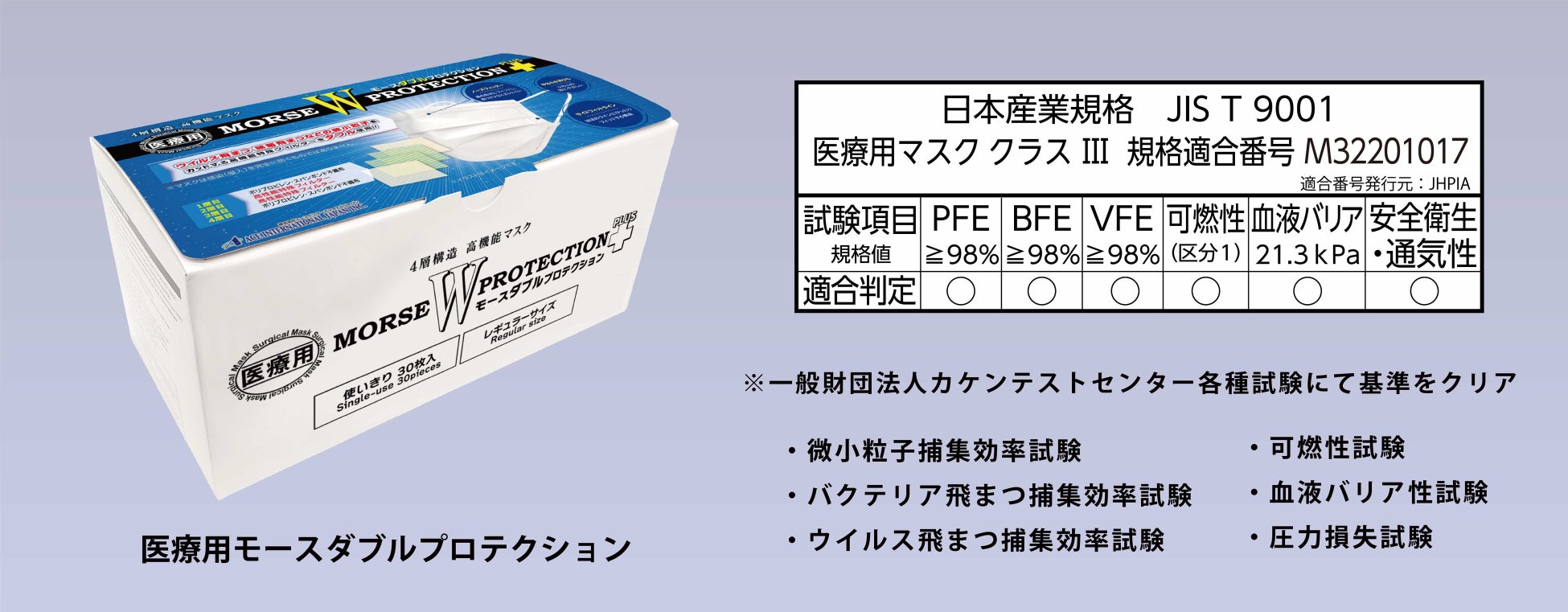 この度、ウイルス飛まつ・細菌飛まつをブロックできる高機能フィルタをダブルで使用した「モースダブルプロテクション」において、医療用の最高クラスであるクラスⅢに適合と審査されたことで、より一層皆様の危機管理に寄与できるものと確信しております。現在、ひっ迫している医療現場だけでなく、日常の感染対策にもご使用いただけます。
