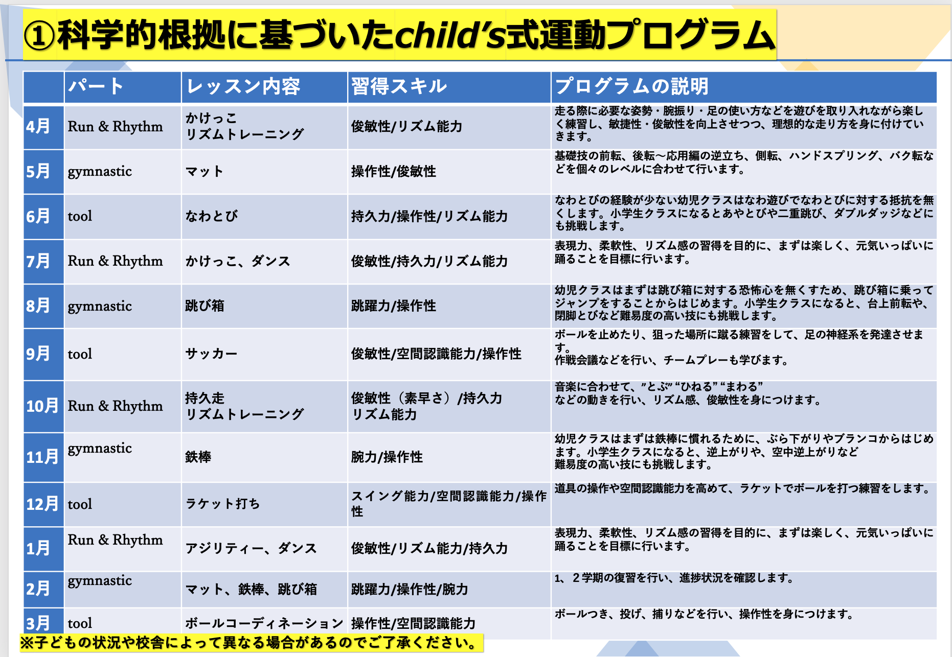 10年間で延べ1万人以上の子ども達を指導してきたchild'sのスタッフ達が考案。