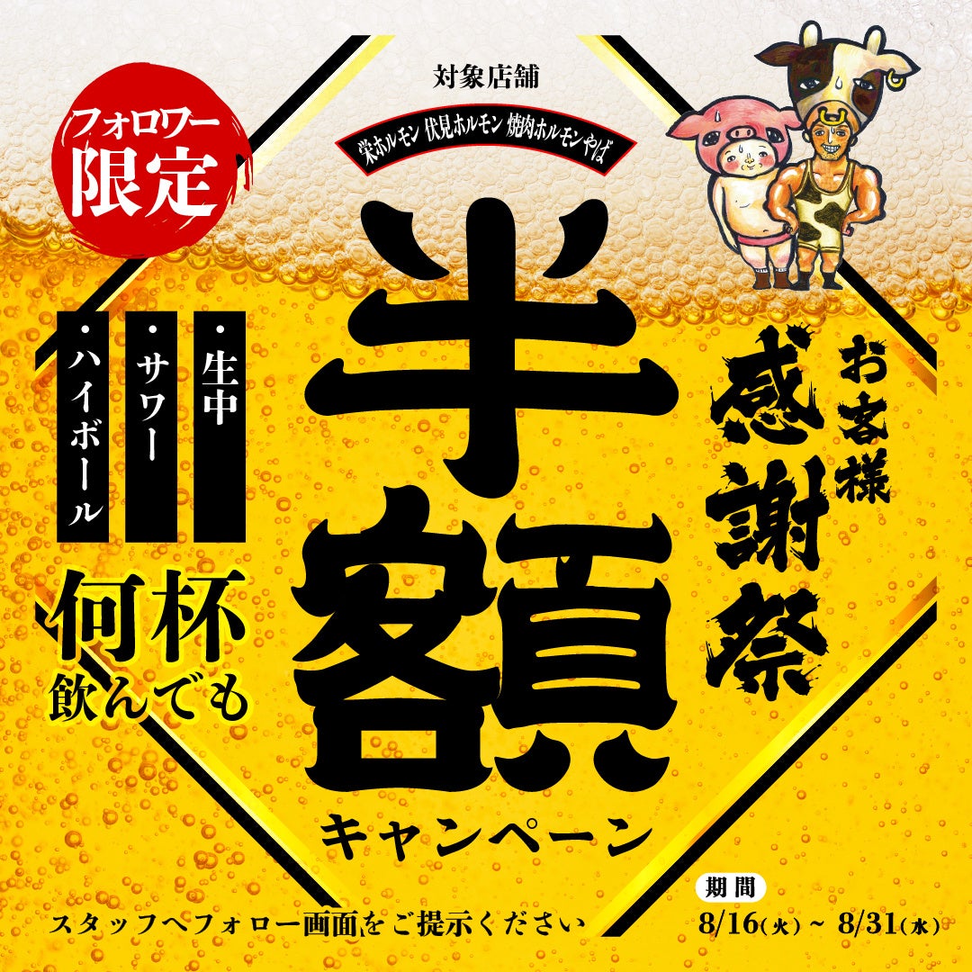 8/16(火)〜8/31(水)の期間限定!フォロワー限定で「生中」「サワー」「ハイボール」を何杯飲んでも半額で提供!