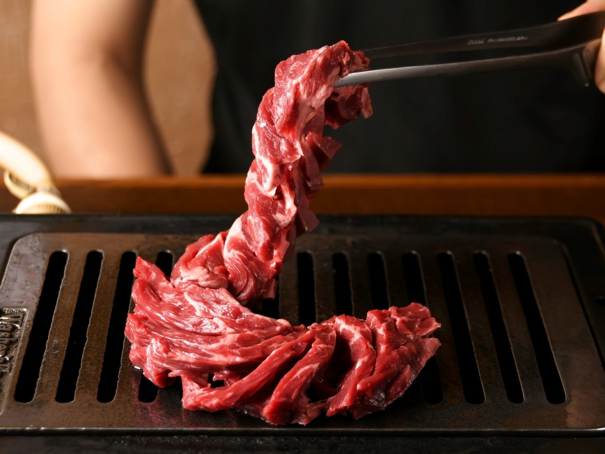 ボリュームたっぷりでインパクト抜群の豪快なハラミの一枚焼きをハサミでカットしてお召し上がり頂けます。