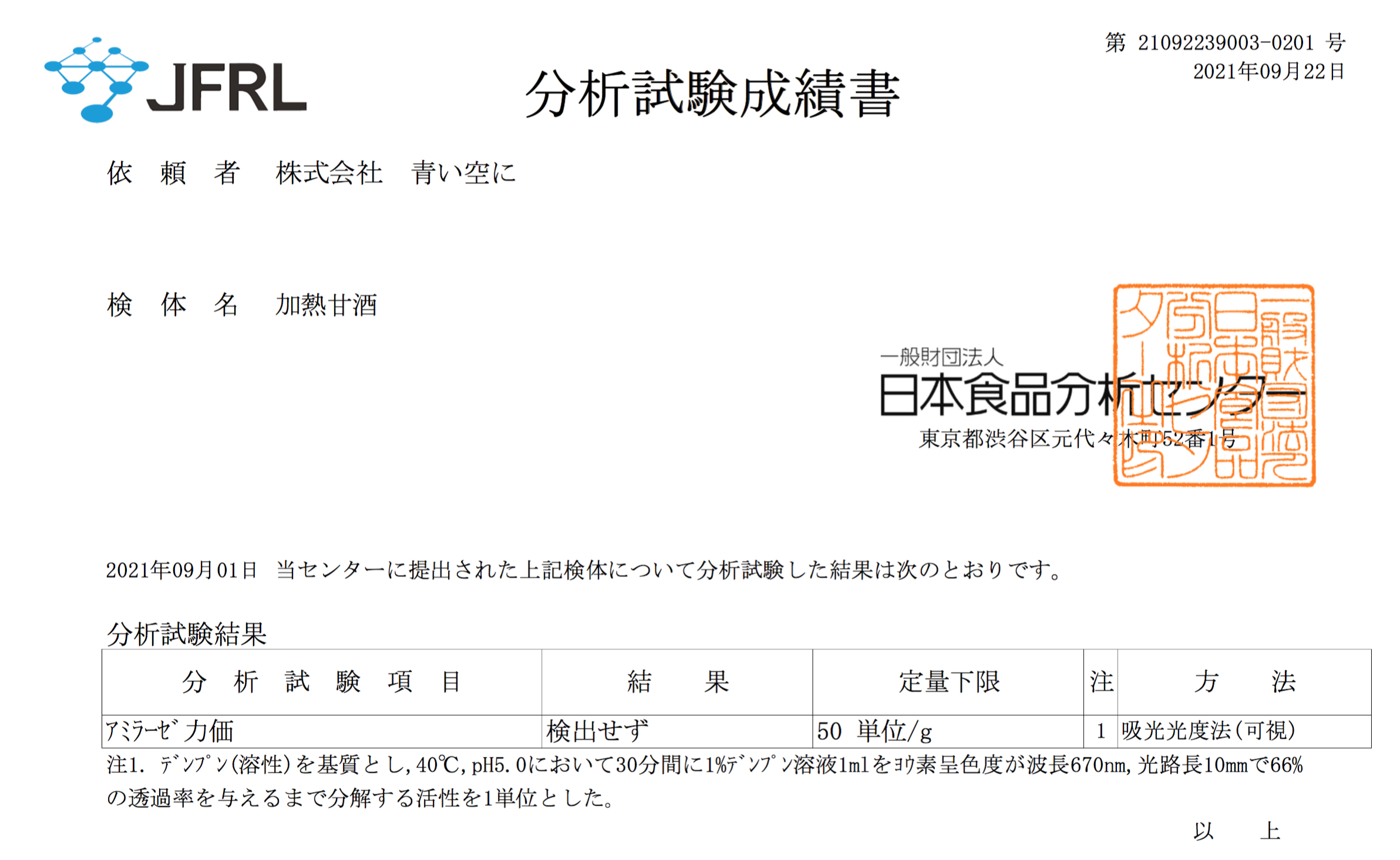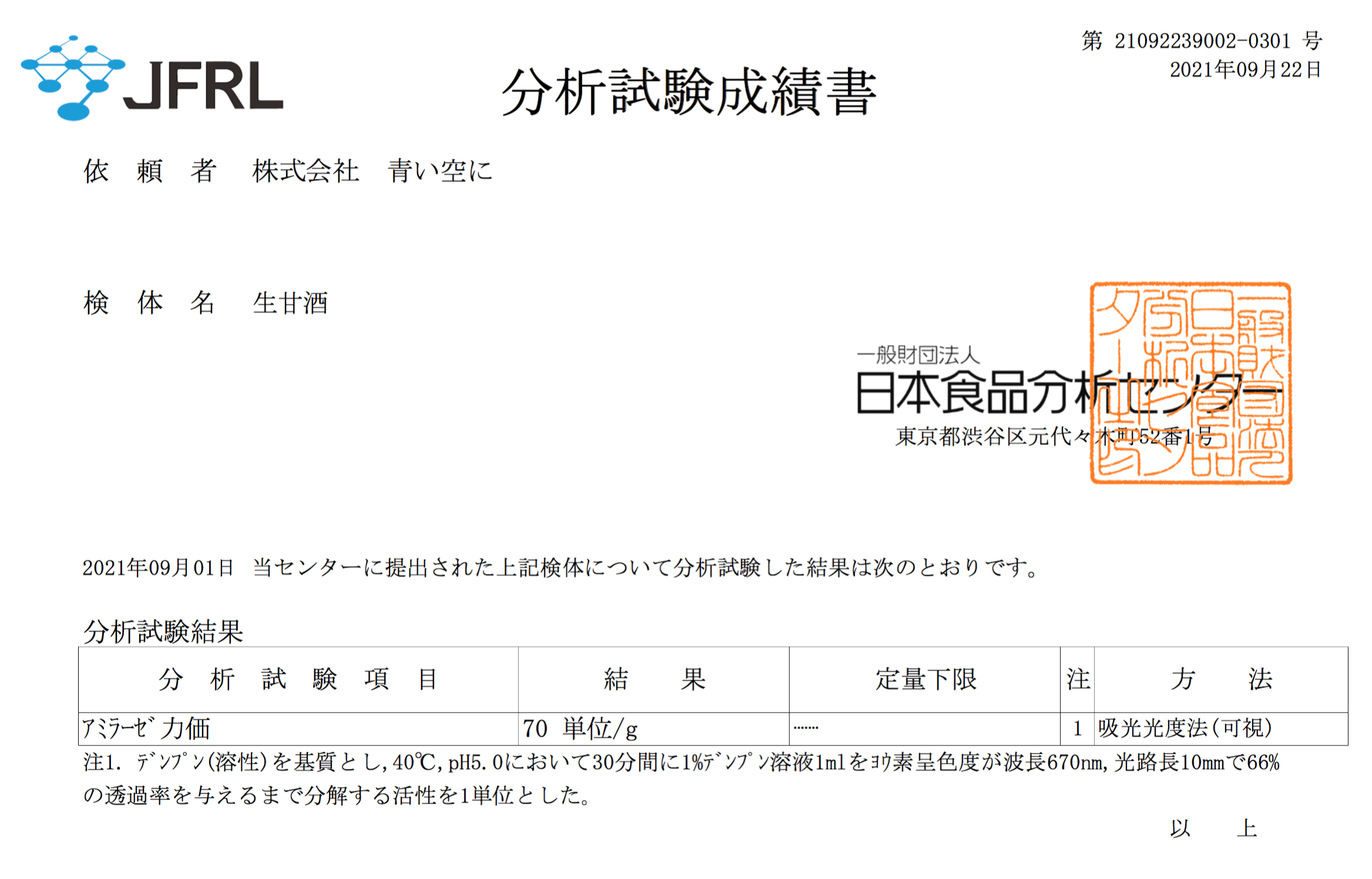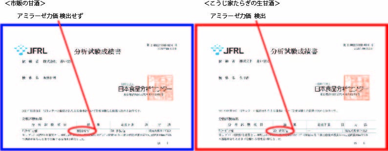一般的に市販されている甘酒は、加熱殺菌されており、酵素が不活性である。同店は、アミラーゼ力価検査を行い、酵素活性が認められた生の甘酒を使用して「美腸麹スイーツ」を製造している。甘酒特有の臭みがなく、優しいもち米の甘さは、「飲みやすい」と甘酒嫌いだった方にも好評だ。