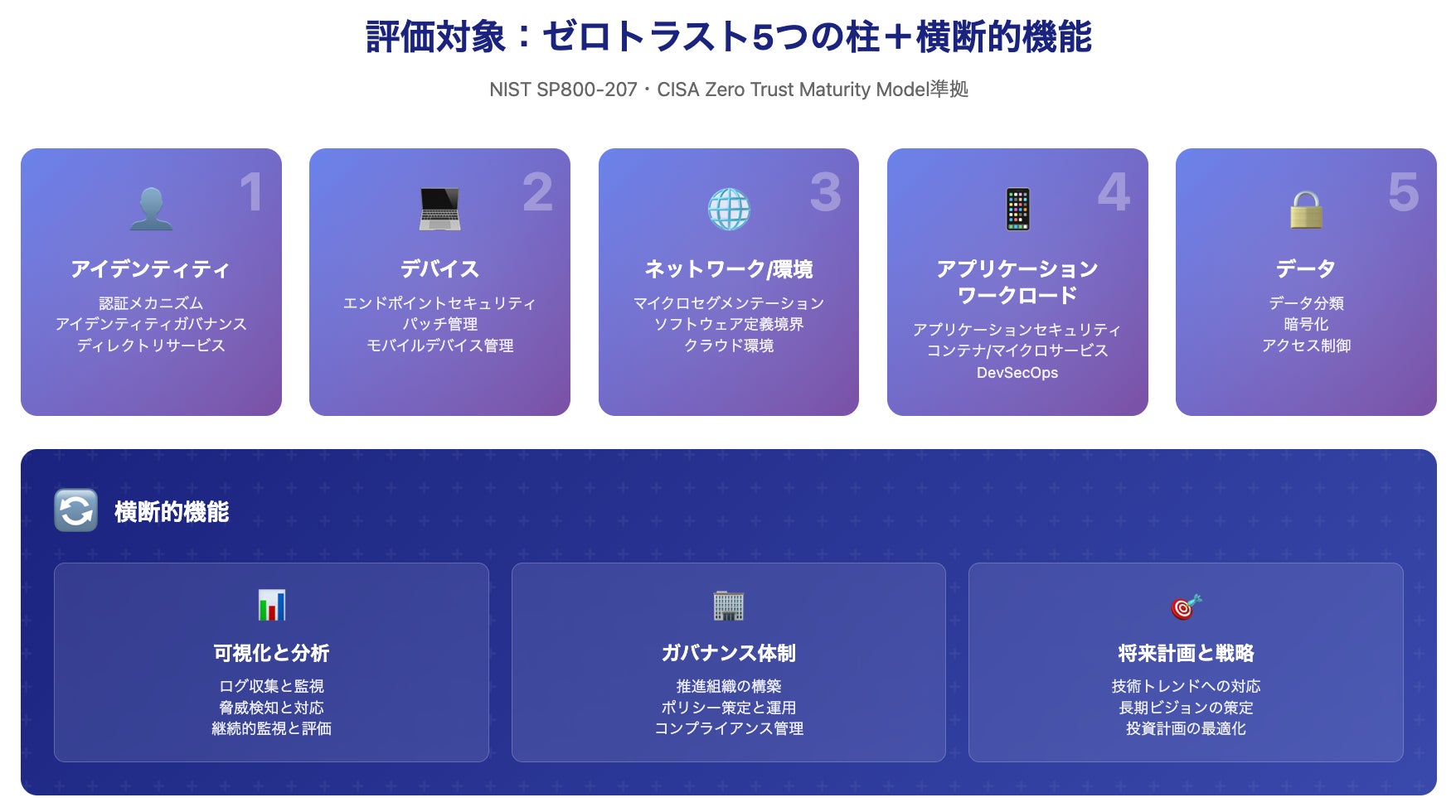 本サービスでは、米国国立標準技術研究所(NIST)が発行したSP800-207「Zero Trust Architecture」および米国サイバーセキュリティ・インフラストラクチャ庁(CISA)の「Zero Trust Maturity Model」に基づいた評価フレームワークを採用しています。これらは米国連邦政府機関で採用される世界最高水準のセキュリティ標準であり、グローバル企業や重要インフラ事業者にも広く認知されています。