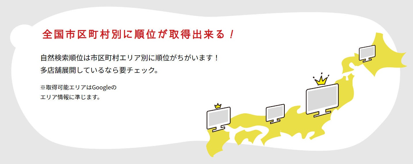 都道府県、市区町村別に順位を取得できます。複数店舗のある路面店でも細かく順位をチェックし、対策を練ることができます。