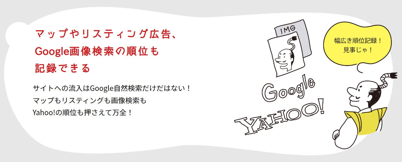 有料プランは1キーワードあたり0.16円/月。マップ順位、広告順位、画像順位、競合順位も同時にチェックしクラウド保存。