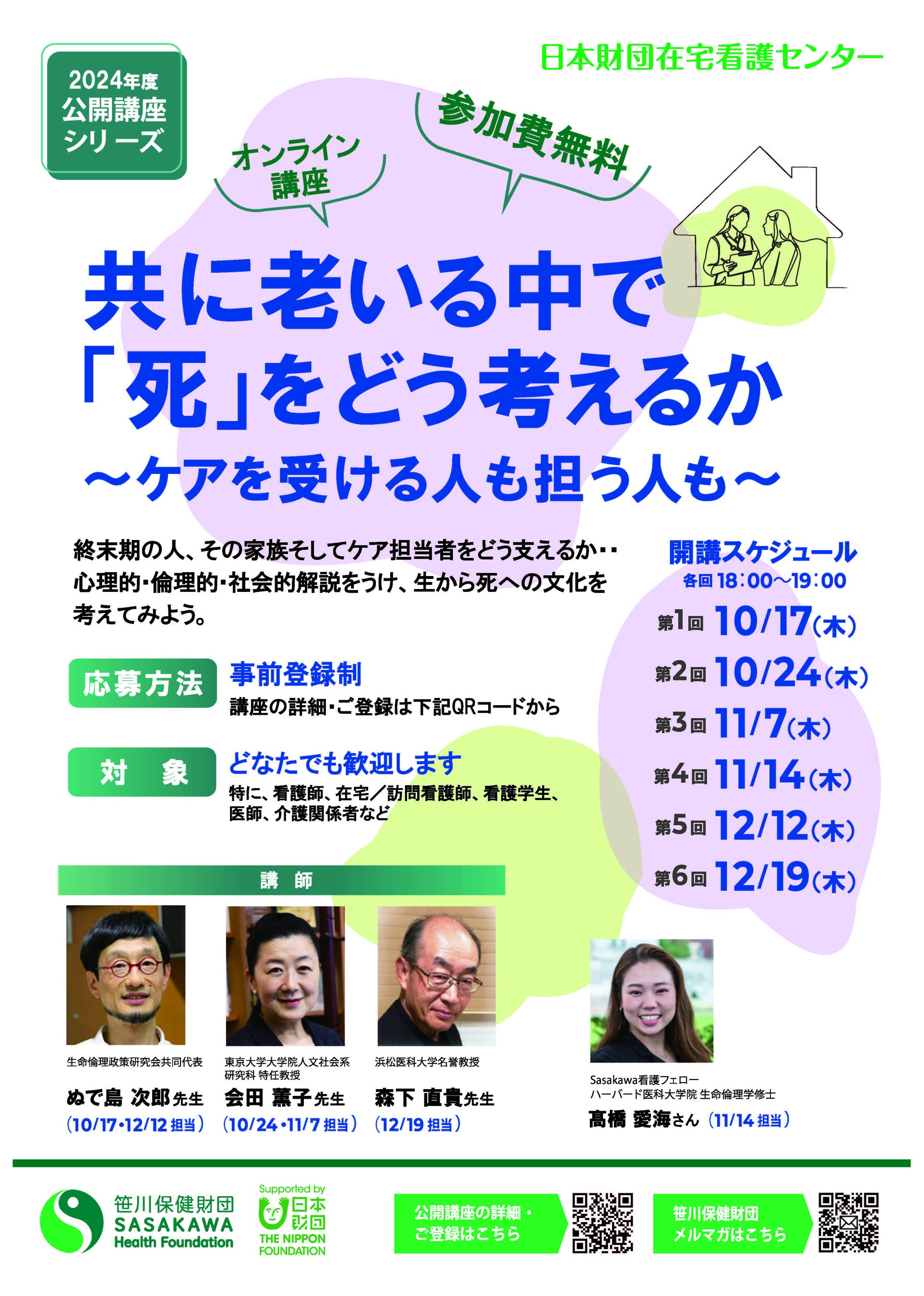 笹川保健財団(東京都港区、会長 喜多悦子)は、2024年10月17日(木)より、「共に老いる中で『死』をどう考えるか 〜ケアを受ける人も担う人も〜」と題して、6回シリーズのオンライン公開講座を開催いたします。