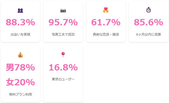 利用開始から時間が経過するにつれて着実に成果が上がり、6ヶ月以内に85.6%の人が出会いを実現しています。継続的な利用が成功の鍵となることが明らかになりました。