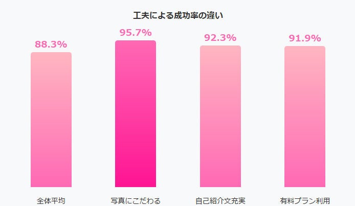 調査結果から、特定の工夫をしている人の成功率が顕著に高いことが判明しました。プロフィール写真にこだわることで、全体平均より7.4ポイント高い95.7%の成功率を達成できることがわかりました。