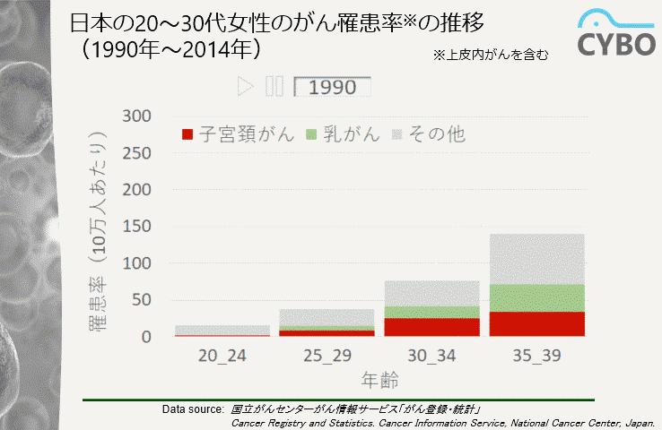 近年、子宮頸がんは日本の若い女性で増加しており、少子化問題に重要な影響を与えています。図1は、1990年以降における20代~30代の日本人女性の子宮頸がん、乳がん、およびその他のがんについて、罹患率の推移を示したアニメーションです。2000年以降、子宮頸がんの罹患率が急増している様子が示されております。子宮頸がんは発見が遅れると治療のために子宮を摘出することもあるため、妊娠可能年齢での子宮頸がんの広がりは少子化問題にもつながる社会的問題なのです。