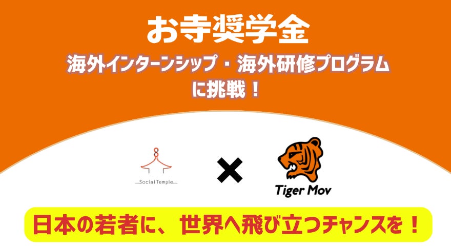 現代の寺院と僧侶のあり方を考える⼀般社団法⼈SOCIAL TEMPLEと越境探究プログラムを提供するタイガーモブがコラボ!日本全国の中学生から大学生まで、タイガーモブが主催する長期海外インターンシップ/短期海外研修プログラム(タイガーモブスクール)に挑戦したい方に向けて、返済不要な特別奨学金を支給いたします!