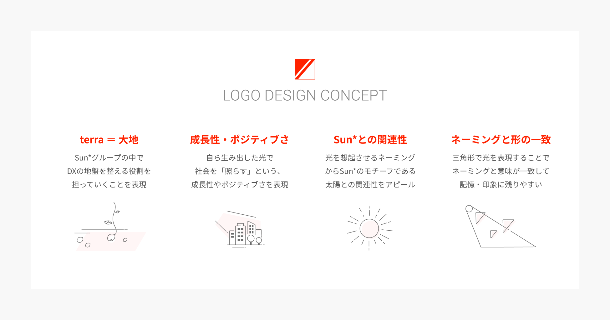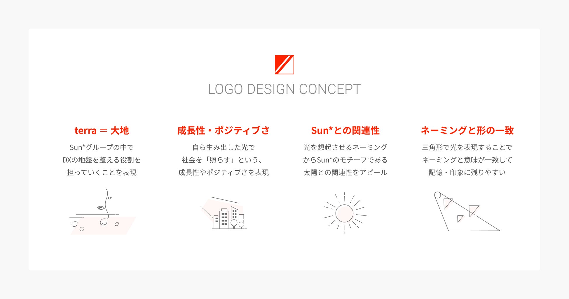”terra” には大地という意味が込められています。Sun*グループの中でDXの地盤を整え、社会を照らし、ポジティブなアップデートを仕掛けて行きます。