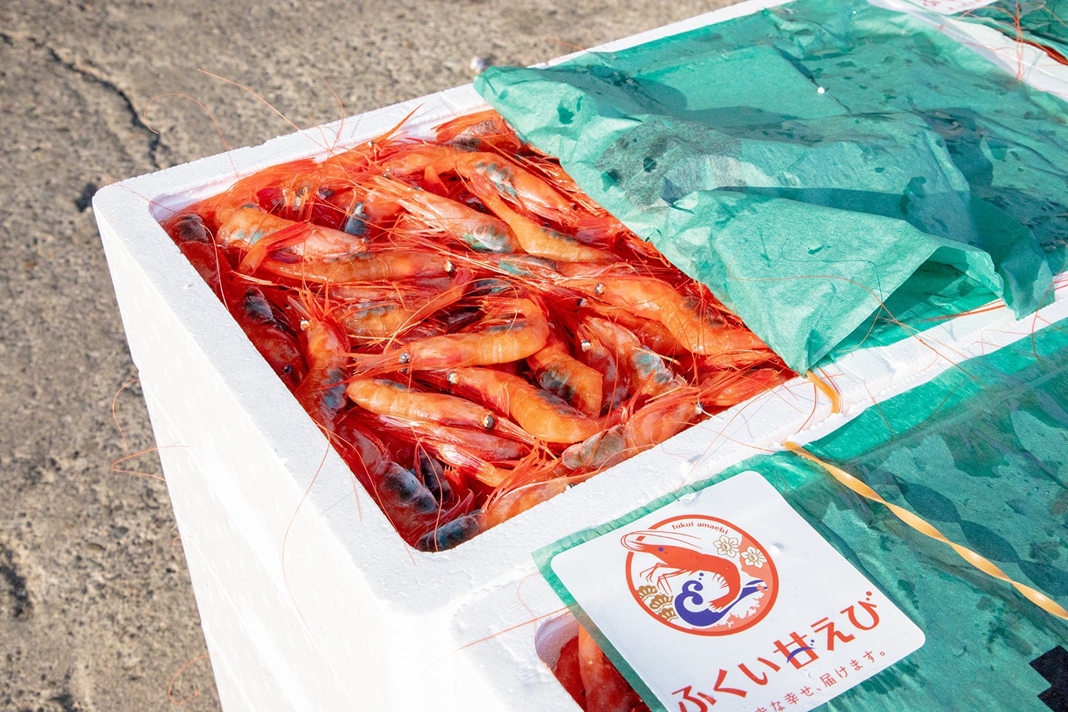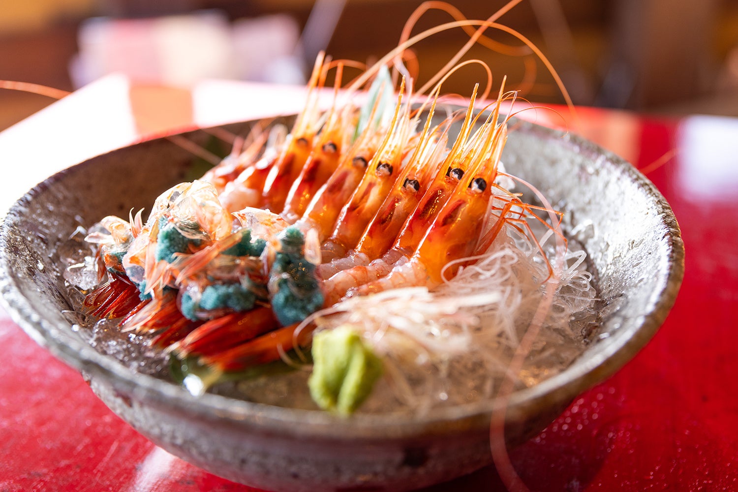 「甘えび」の語源は、食べたときに甘みを感じることから。その名のとおり、一口頬張れば”ぷりぷり”と身がはじけて、口の中いっぱいに”甘味”が広がります。新鮮な甘えびは、透明感のある真っ赤に輝くからだが目を引きます。