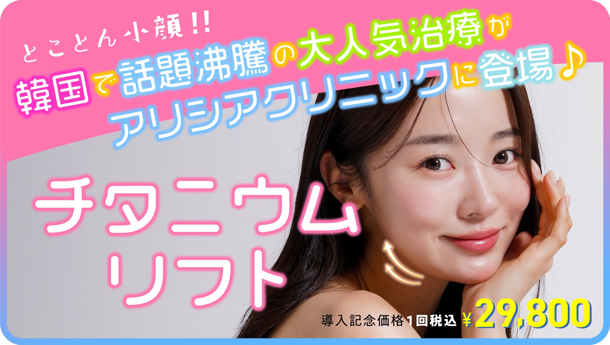 今なら、アリシアクリニックの「チタニウムリフト」を特別価格でお試しいただけるキャンペーンを実施中!この機会に、韓国で大人気のリフトアップ施術を体験してみませんか?限られた期間のキャンペーンですので、お早めのご予約をおすすめします。