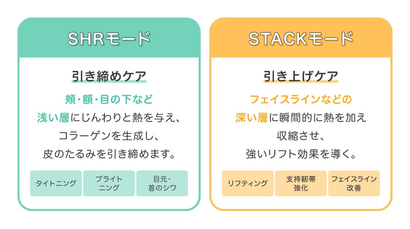 「チタニウムリフト」では、SHRモードとSTACKモードという2つの照射方法を組み合わせることで、肌の深層と表層に同時にアプローチします。