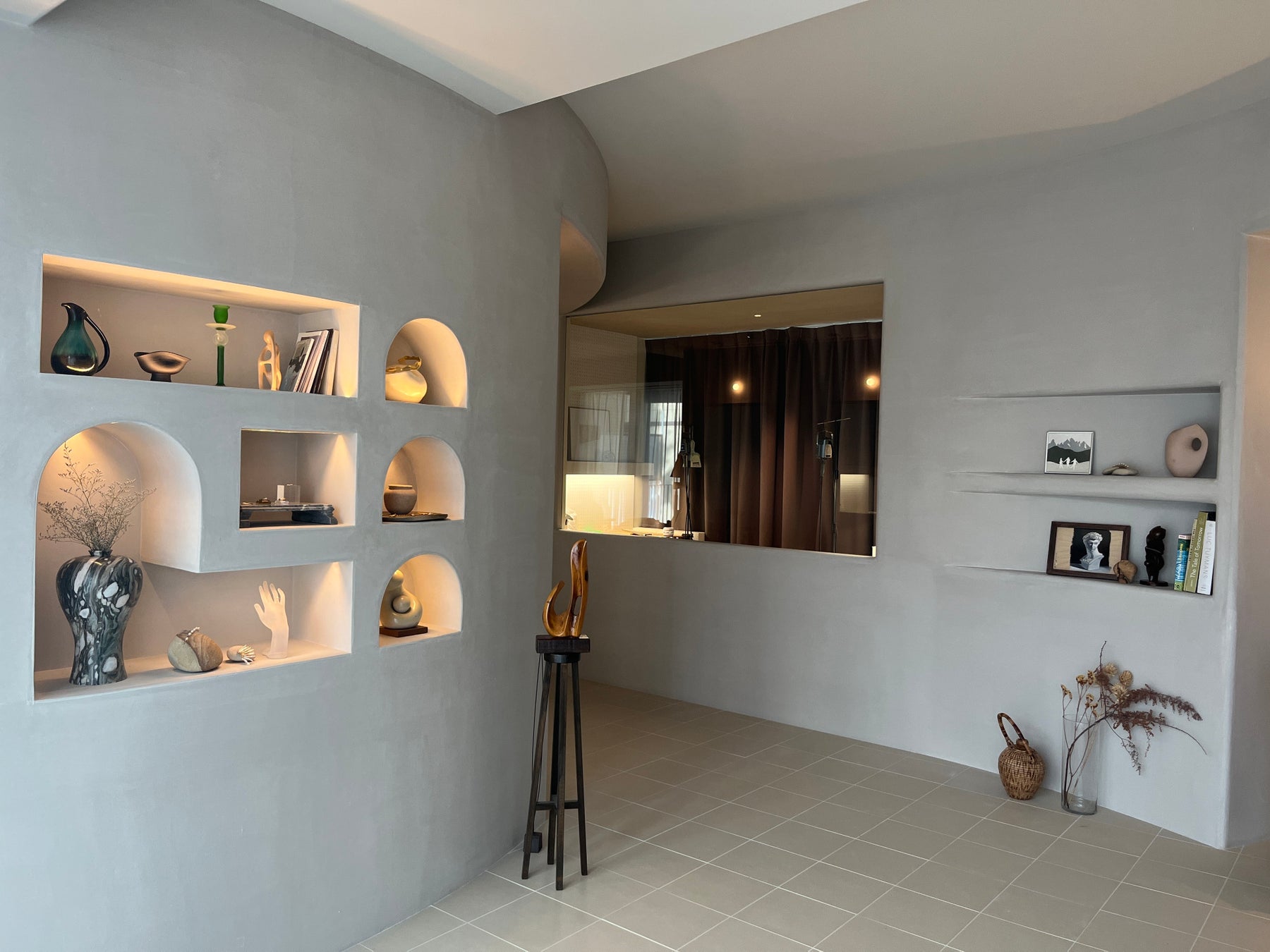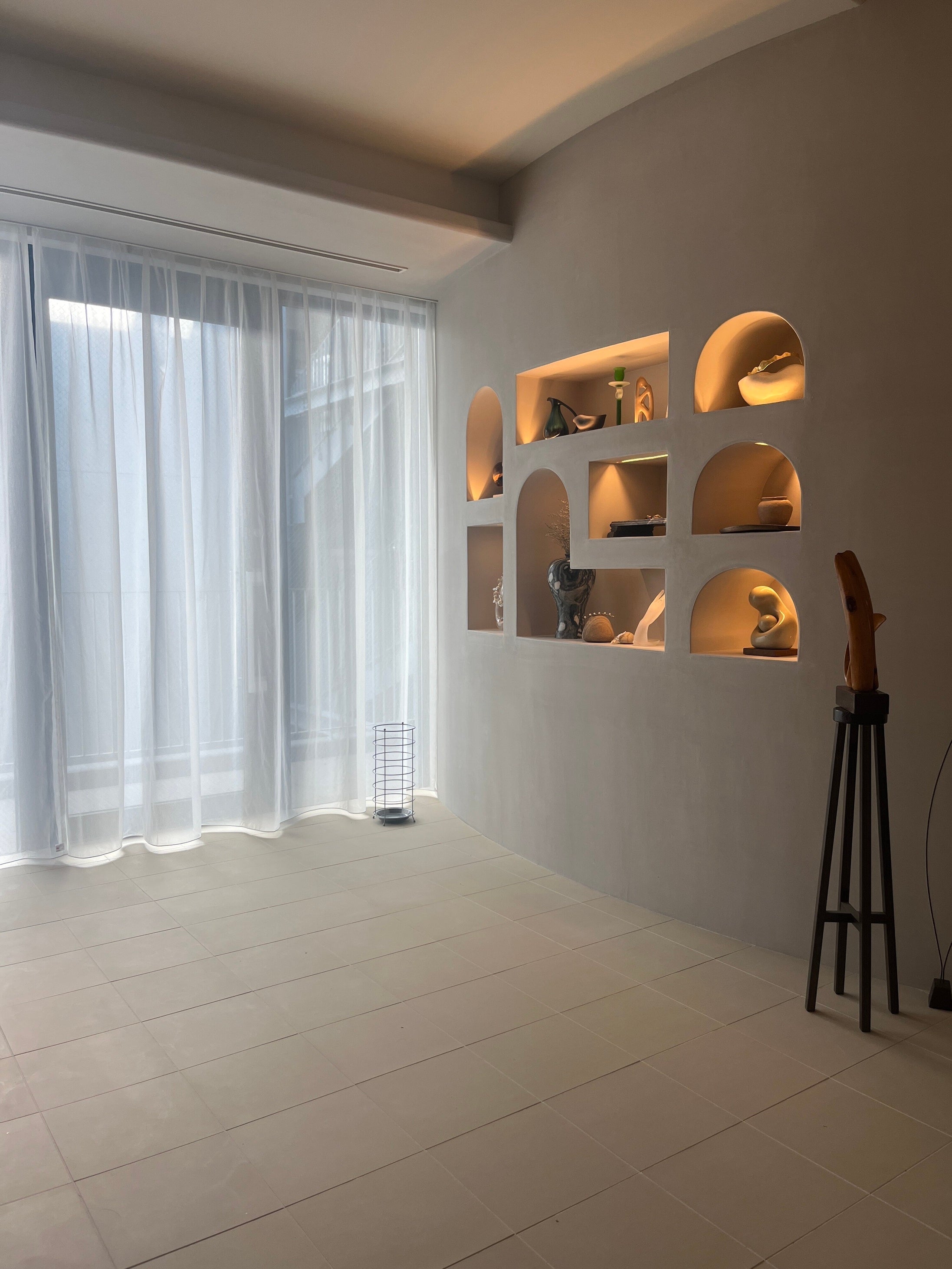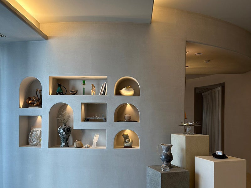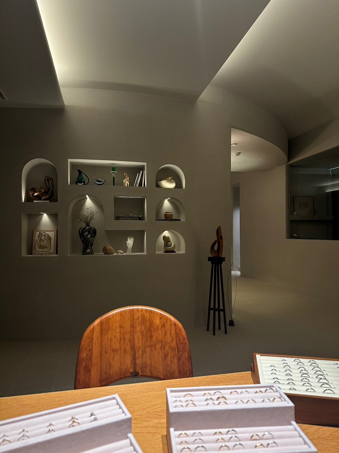 手作業による左官技術を駆使した美しい曲線と、温かみのあるウッドが、1点ずつハンドクラフトで仕上げる製造背景を表現。特徴は、ガラス越しに眺められる彫金室。自社アトリエ製造の様子が眺められます。うっすらとグレーで統一された空間と、あえて陰を造るような照明配置、ギャラリーを想わせるしつらえが、非日常で特別な世界を演出。