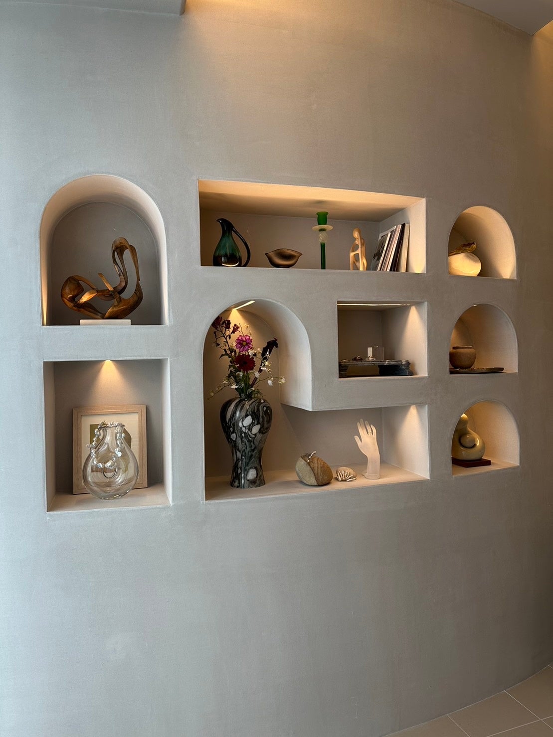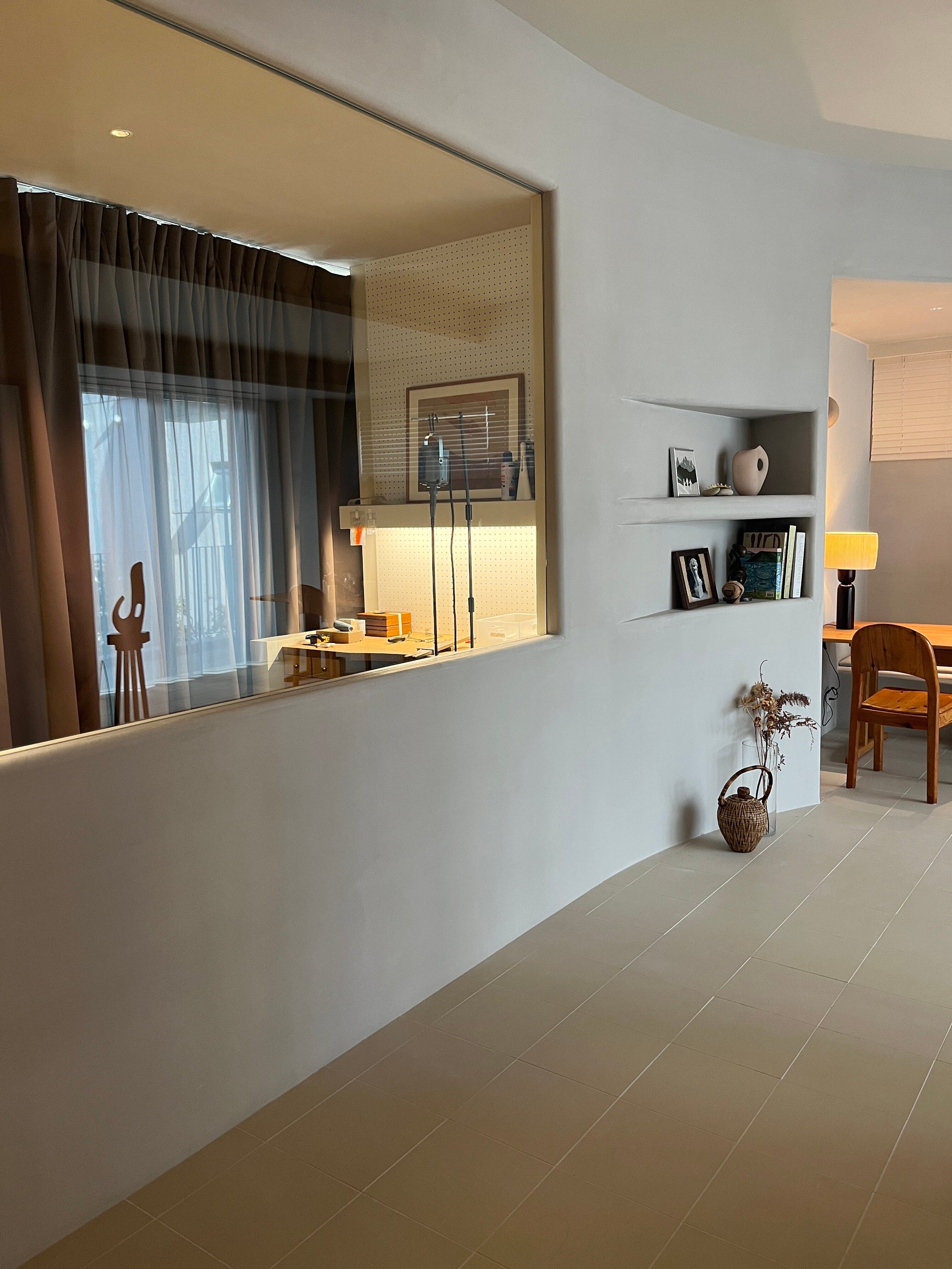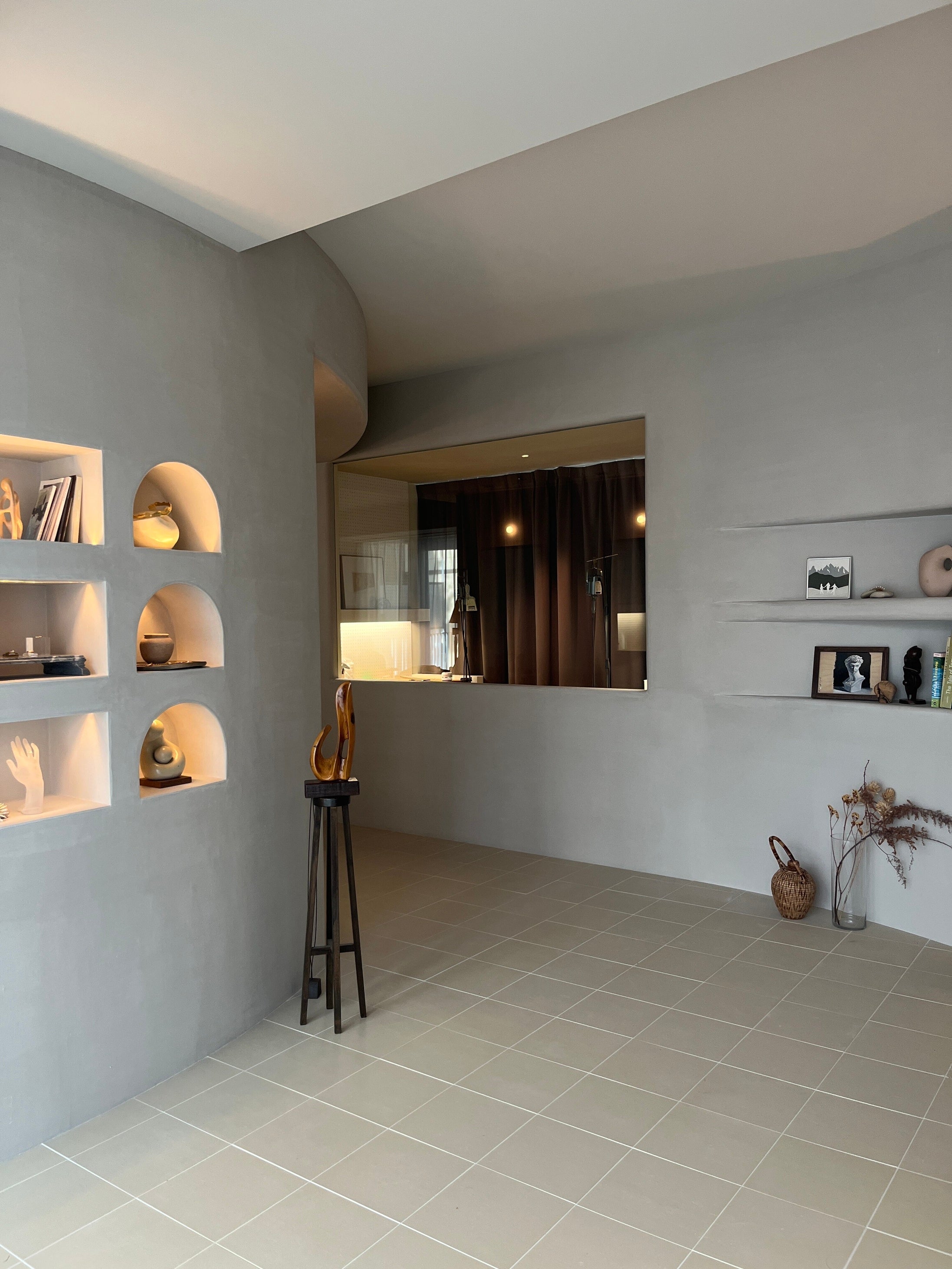 手作業による左官技術を駆使した美しい曲線と、温かみのあるウッドが、1点ずつハンドクラフトで仕上げる製造背景を表現。特徴は、ガラス越しに眺められる彫金室。自社アトリエ製造の様子が眺められます。うっすらとグレーで統一された空間と、あえて陰を造るような照明配置、ギャラリーを想わせるしつらえが、非日常で特別な世界を演出。