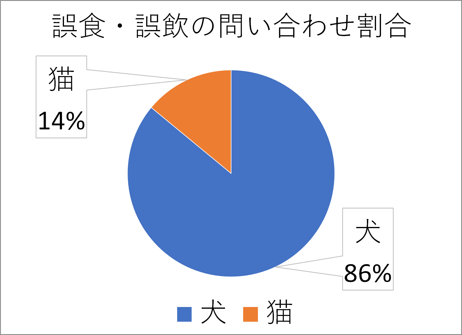 誤飲の問い合わせのうち犬が86%、猫が14%