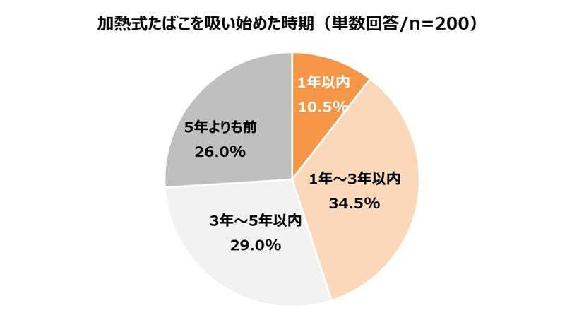 加熱式たばこを吸う方に、加熱式たばこを吸い始めた時期についてお聞きしたところ、「1年以内」「1年~3年以内」との回答が計45.0%となりました。加熱式たばこユーザーのうち、45.0%の方がコロナ禍の期間中であろうこの3年以内に加熱式たばこを吸い始めたようです。