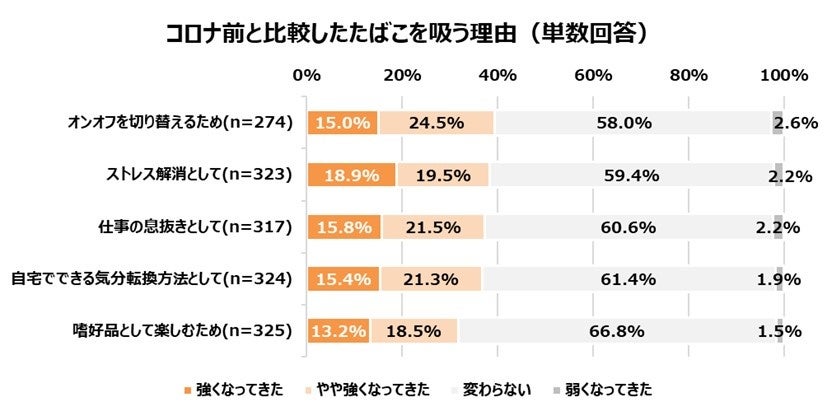 <調査背景>コロナ禍によって一変した私たちの生活様式。その中で、個々人の状態や、気分転換・息抜きに対する考え方、その方法についても変化があるようです。また、気分転換やストレス解消のために吸われていたたばこも、より能動的に嗜好し、楽しむものへと位置づけが変わりつつあります。そうした状況を踏まえ、時代の変化を明らかにするべく「コロナ禍と喫煙に関する調査」を行ないました。報道の一資料として、ぜひご活用ください。