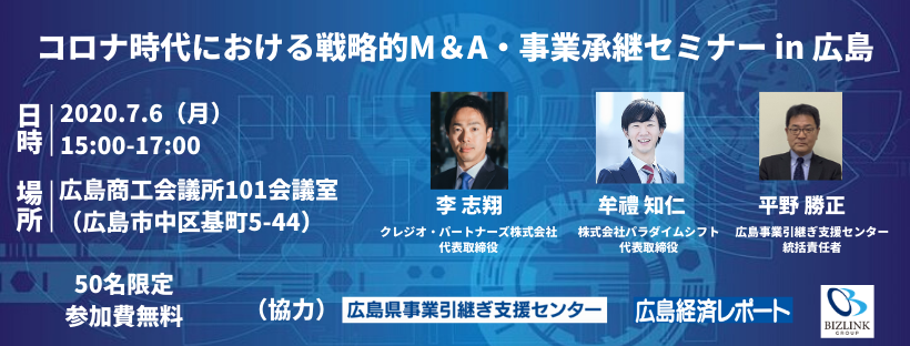 ゲストに「IT×M&Aで革新を促す」を理念に掲げ、「IT×M&A」のパイオニアであり、トップランナーであるパラダイムシフト株式会社代表取締役 牟禮 知仁氏を招き、全国でも有数の実績を持つ広島県事業引継ぎ支援センターに加え、地域を支える経済メディアである広島経済レポートと連携し、コロナ禍を見据えた新しい時代の地域におけるM&A・事業承継をテーマにセミナー・パネルディスカッションを実施します。