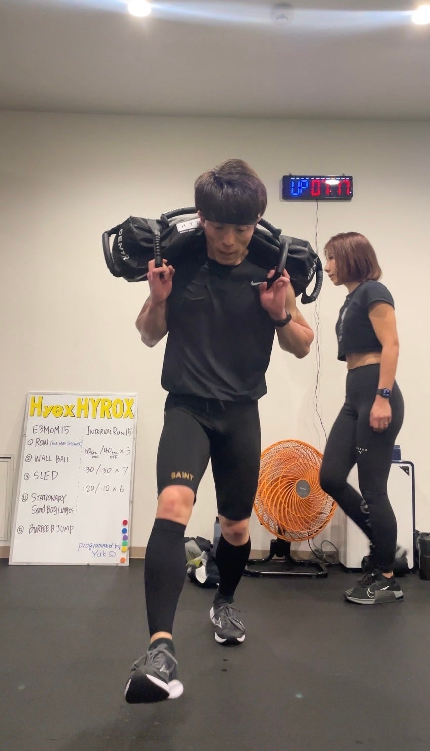 HYROX特有のSled Push(ソリ押し)やBurpees(バーピー)といった激しい動きも、