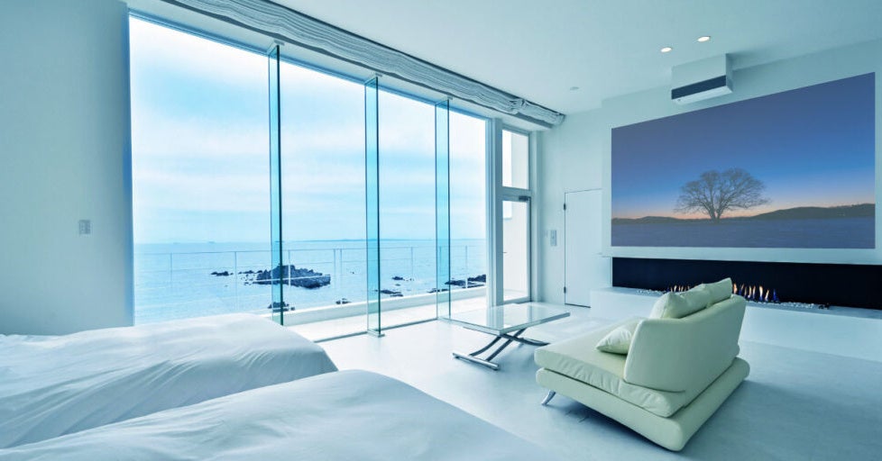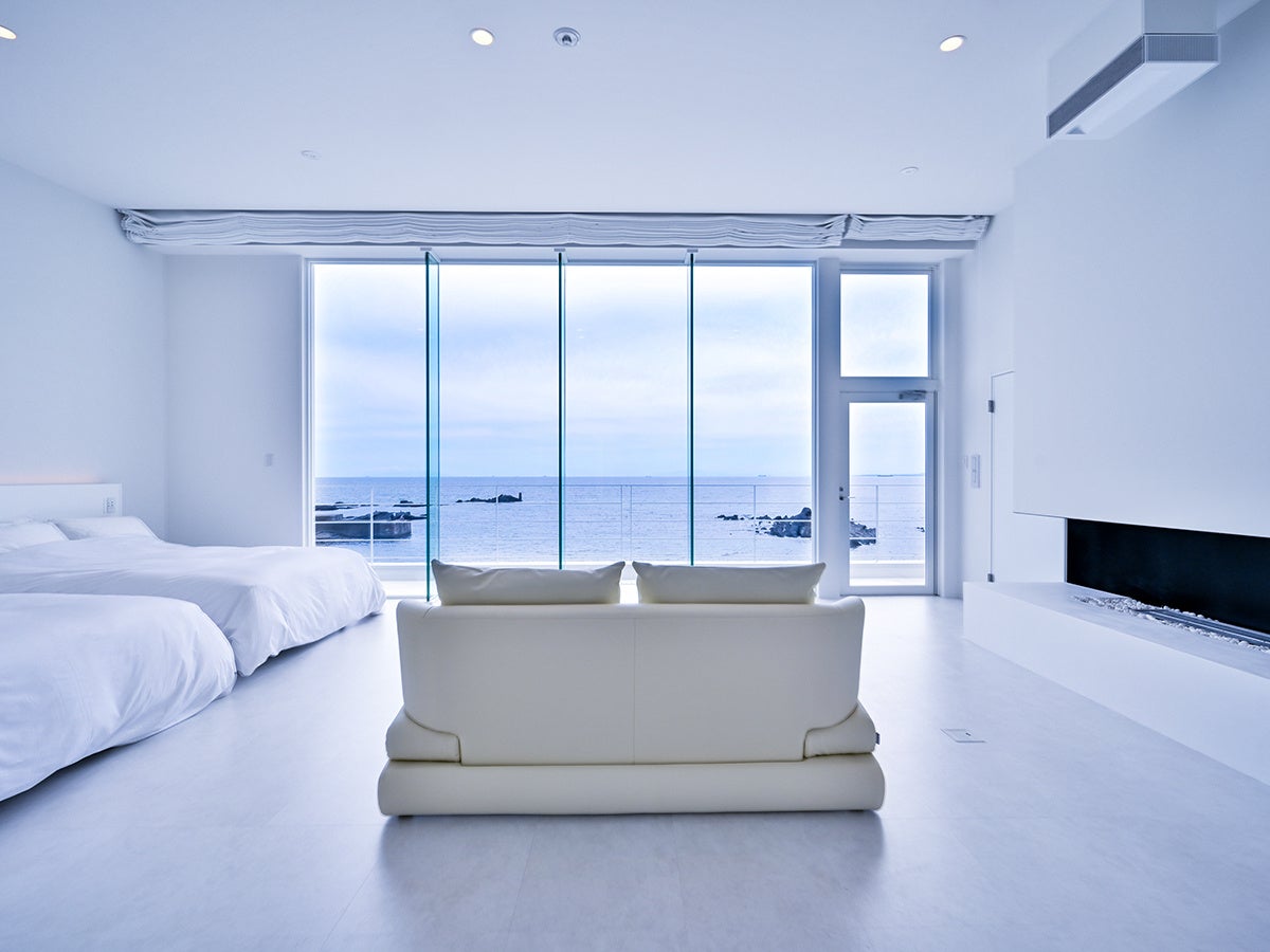 正面に東京湾と富士山を望み、延べ床面積約170㎡のゆとりある客室にBBQ設備や焚火を完備したテラスや室内にはサウナ、キッチン、120インチのプロジェクターTVを設置しております。最大8名まで宿泊可能なプライベート・ヴィラで、自由な過ごし方を楽しむことができます。キッチン・トイレや浴室は1F・2Fどちらにも完備しているため、2グループのご宿泊にも最適です。カップルで、ファミリーで、お友達と、海をゆったり堪能するにも、または千葉旅行の拠点としてご利用もおすすめです。
