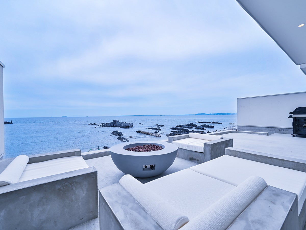 ガーデンソファーを設置したテラスでは、海を間近に感じながらBBQがお楽しみいただけます。 また、1F室内には3人まで入れる専用サウナもご用意しております。