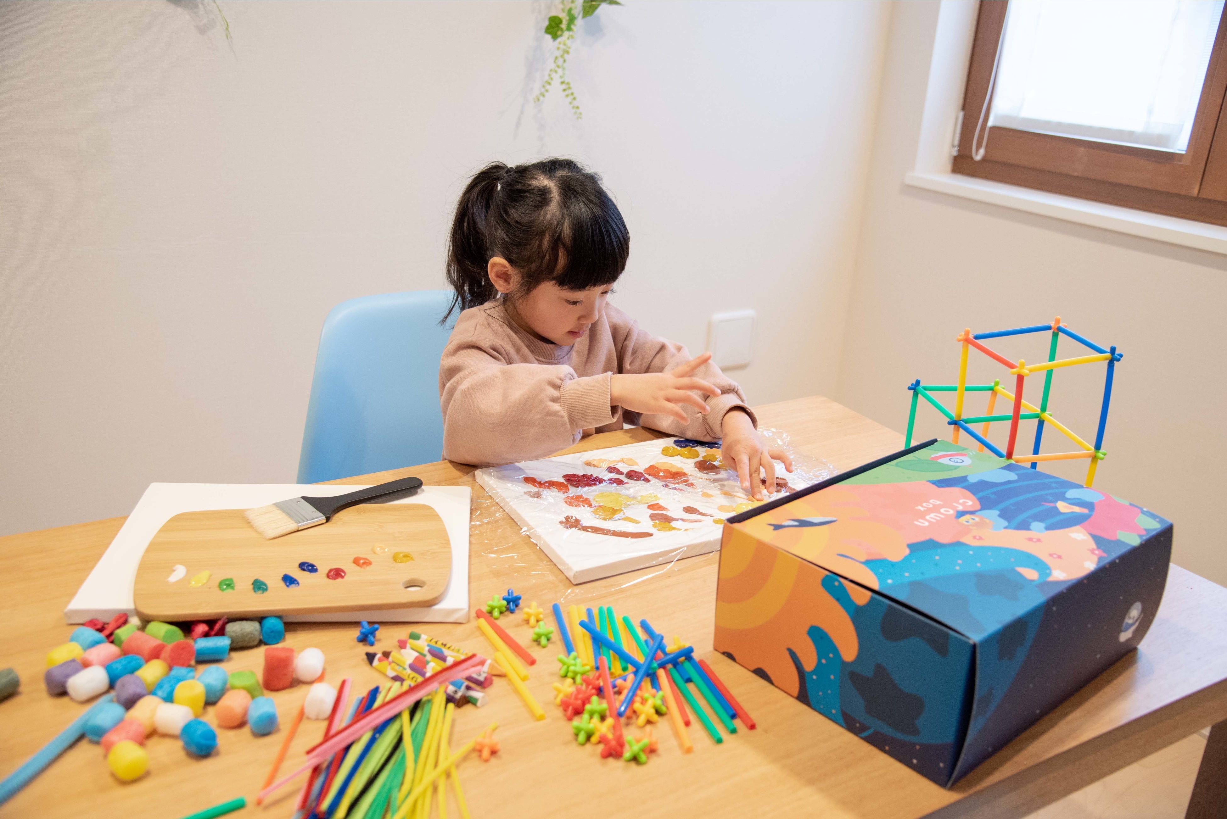 3~6歳の子どもを対象とした創作活動のキットを、子どもの性格や興味などに合わせて毎月自宅へ配送いたします。クラウンボックスでは、社会で困難に立ち向かい未来を切り拓いていくことを冒険に喩え、子どもたちが自由度の高い遊びを通して「冒険力」を育むことを目指しています。