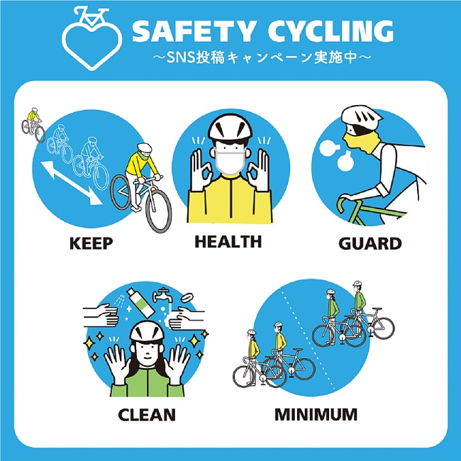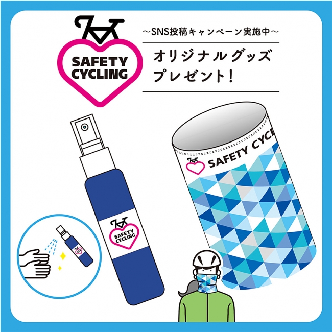 SNSでキャッチコピー(SAFETY CYCLING)に#(ハッシュタグ)を付け、投稿してもらう県民参加型の広報活動を実施する。投稿し、応募フォームで応募した方を対象として、オリジナルネックウェアを200名様に、オリジナルスプレーボトル(消毒液携行用)を1,000名様に抽選配布する。