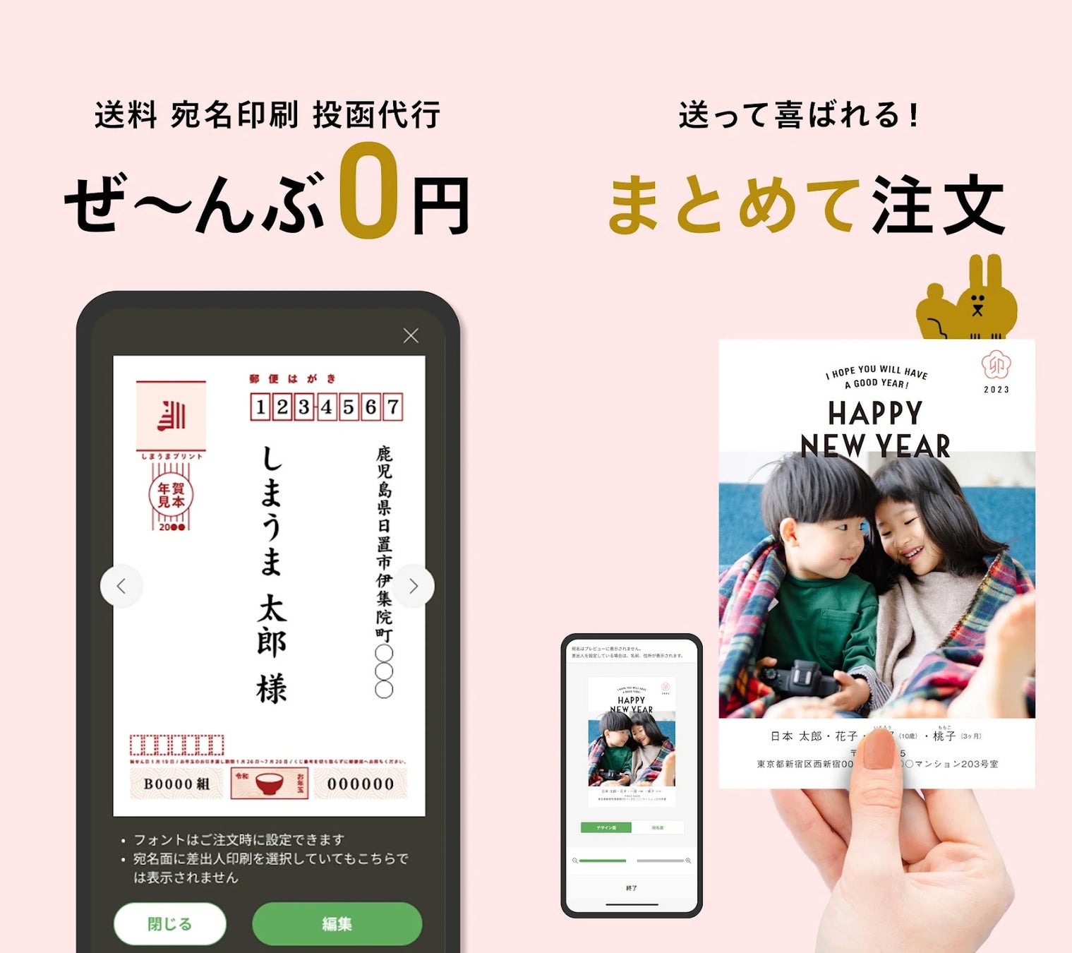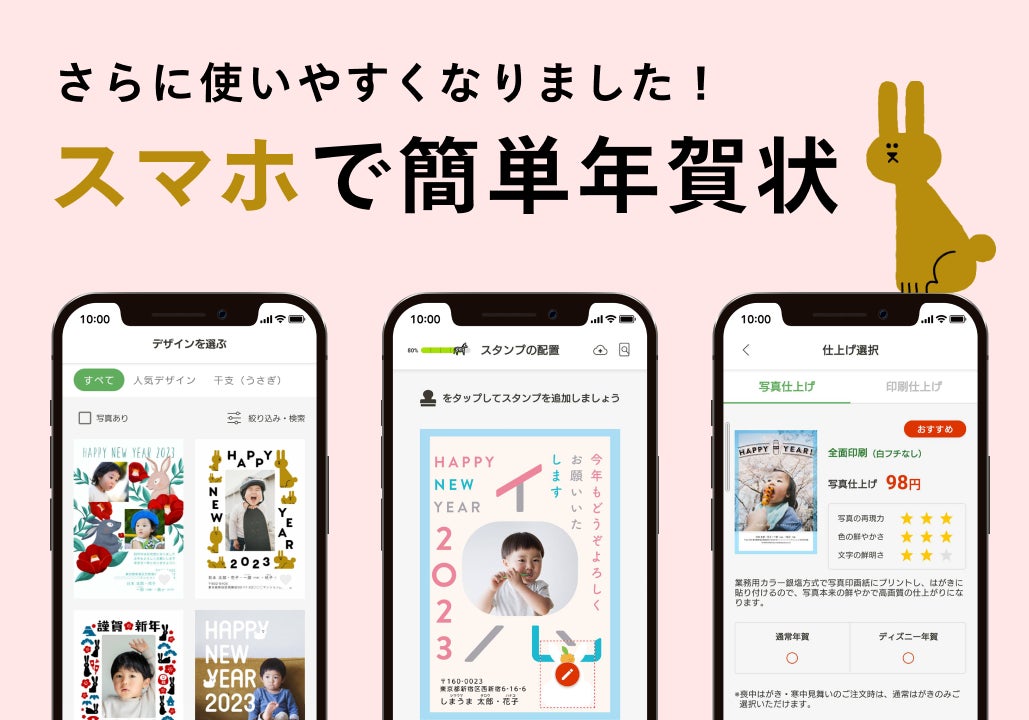 「しまうま年賀状2023」はパソコンからのご注文はもちろん、スマホひとつで簡単に高品質な年賀状を作成でき、印刷から発送までワンストップでご利用いただけます。今回はそんな便利なスマホアプリが、サービス開始から初となる大型リニューアルが行われました。直感的な操作でストレスなくサクサク進められるので、年賀状をつくる楽しさと使いやすさにこだわった「しまうま年賀状2023」をぜひご体感ください。
