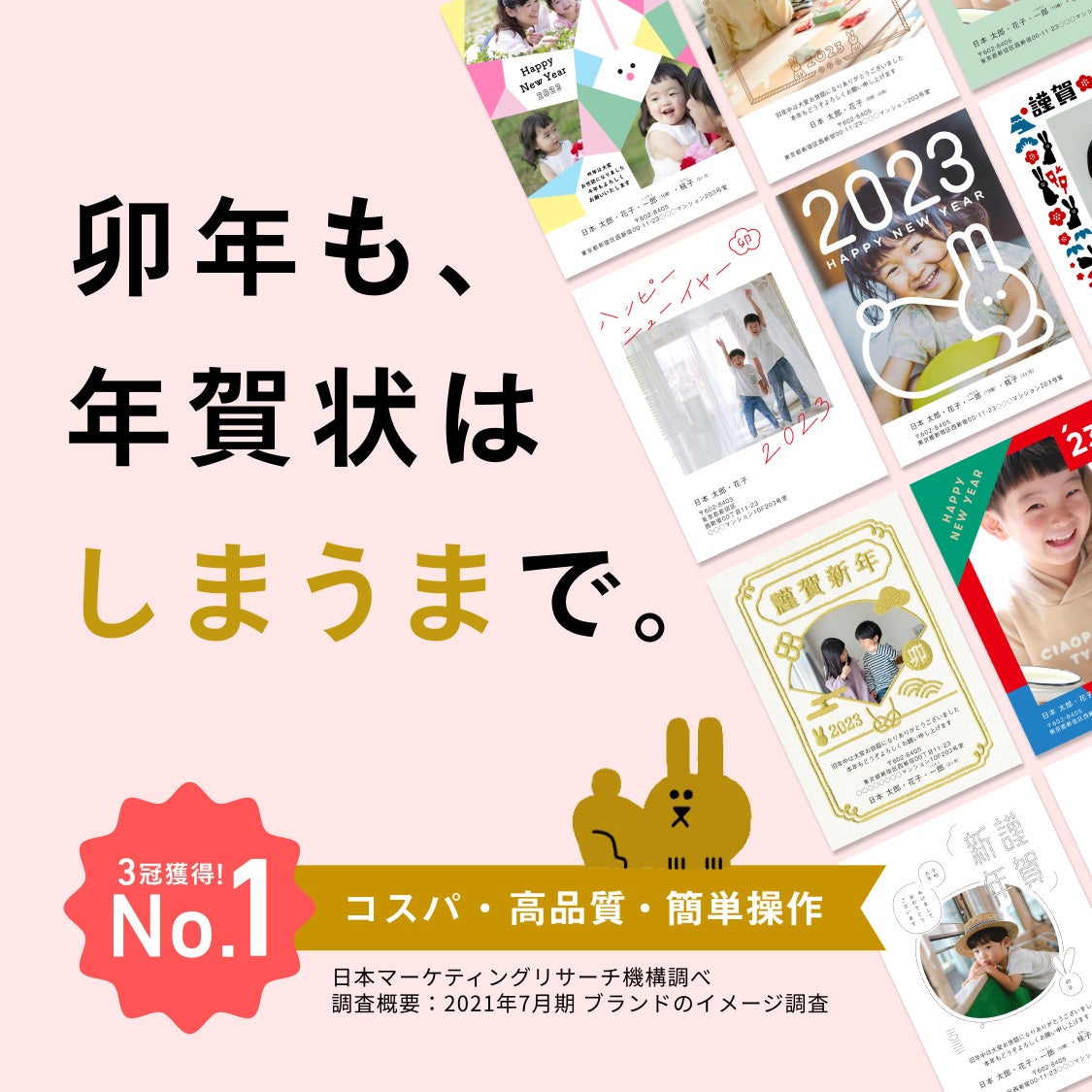 受付開始を記念し、本日より「早割キャンペーン」を実施いたします。キャンペーン期間中にご注文された方は、年賀状プリント料金が最大58%OFFとなりますので、よりお得に年賀状印刷を注文できます(詳しくは随時公式サイトをご確認ください)。※日本マーケティングリサーチ機構調べ、調査概要:2021年7月期 ブランドのイメージ調査