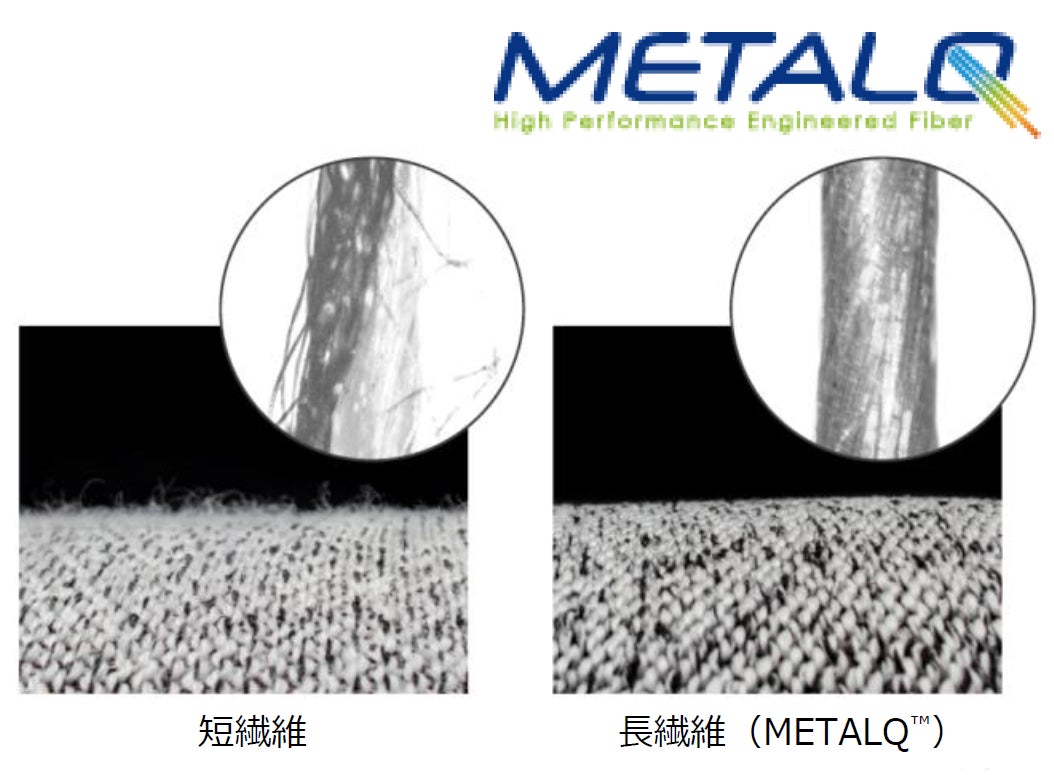 この度開発した「METALQ™」は、国際特許取得の炭素系超高分子技術を応用した自社開発の高機能人工繊維で、高強度かつ超軽量、高耐久性を特長としています。繊維内部に炭素系材料を配合しているため、ガラス繊維や金属繊維を巻き込まなくても単独で高い耐切創性を発揮し、軽くて薄いかつ強くて柔らかい製品に応用が可能です。手袋や作業服など様々な分野で活用することが可能です。洗濯して繰り返し使え、低発塵性とクールな装着感も特長です。