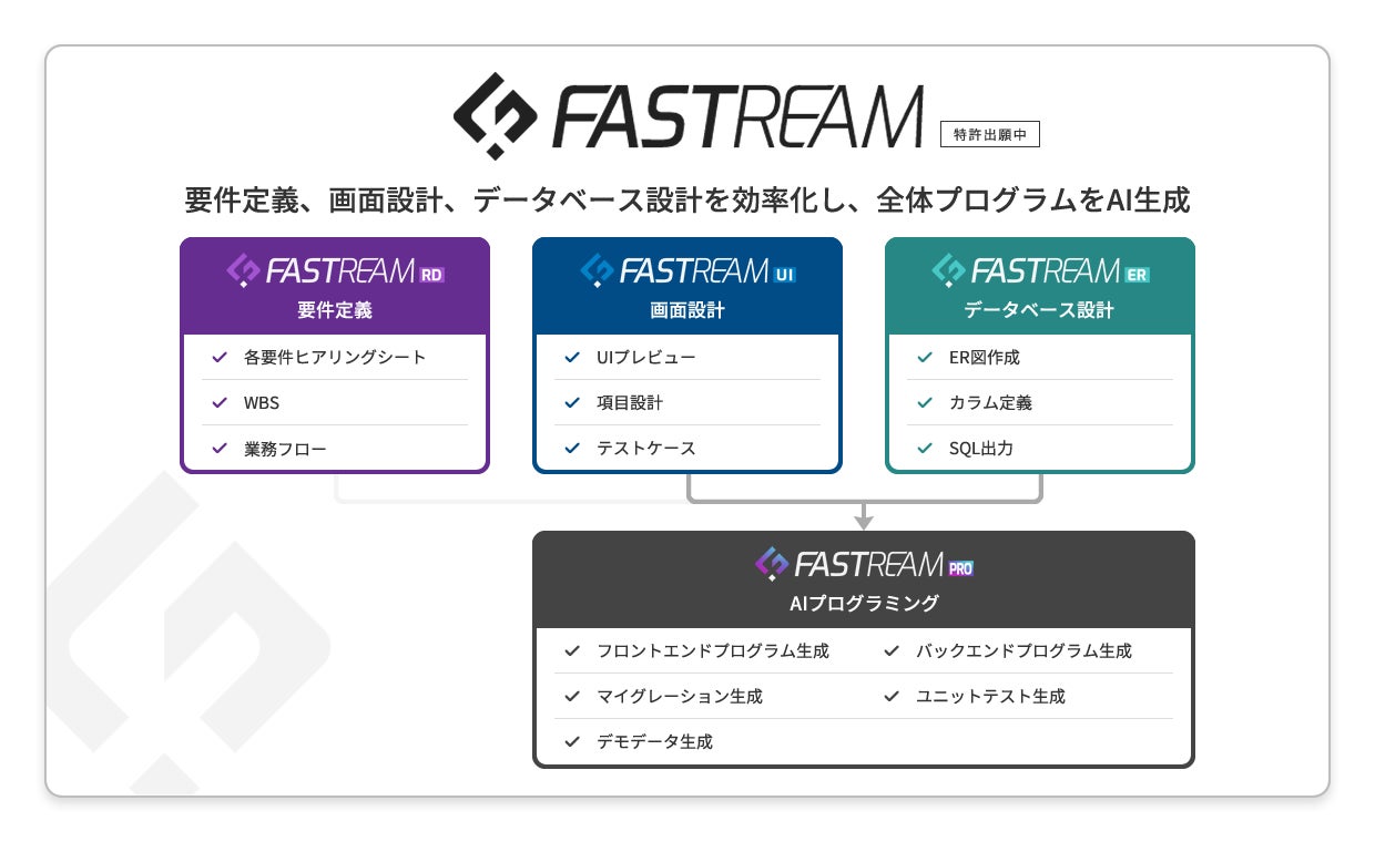 FASTREAMは、要件定義、画面設計、データベース設計を高速化・効率化し、AIプログラミングにより様々な言語/フレームワークの初期開発を実現する、次世代開発クラウドサービスです。