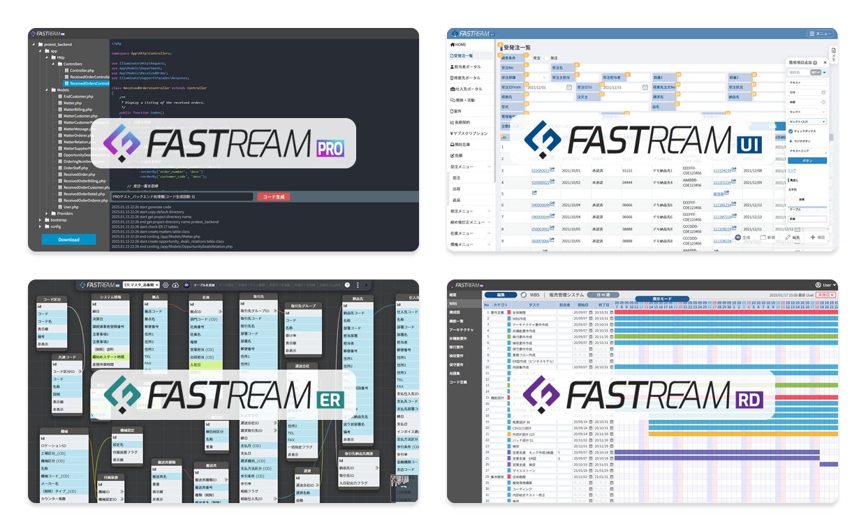 このような課題に対処するため、私たちは設計・開発工程の効率化を追求してきました。そして、実際に様々な業種業界の業務システムを開発する中で生まれたのが、FASTREAMです。