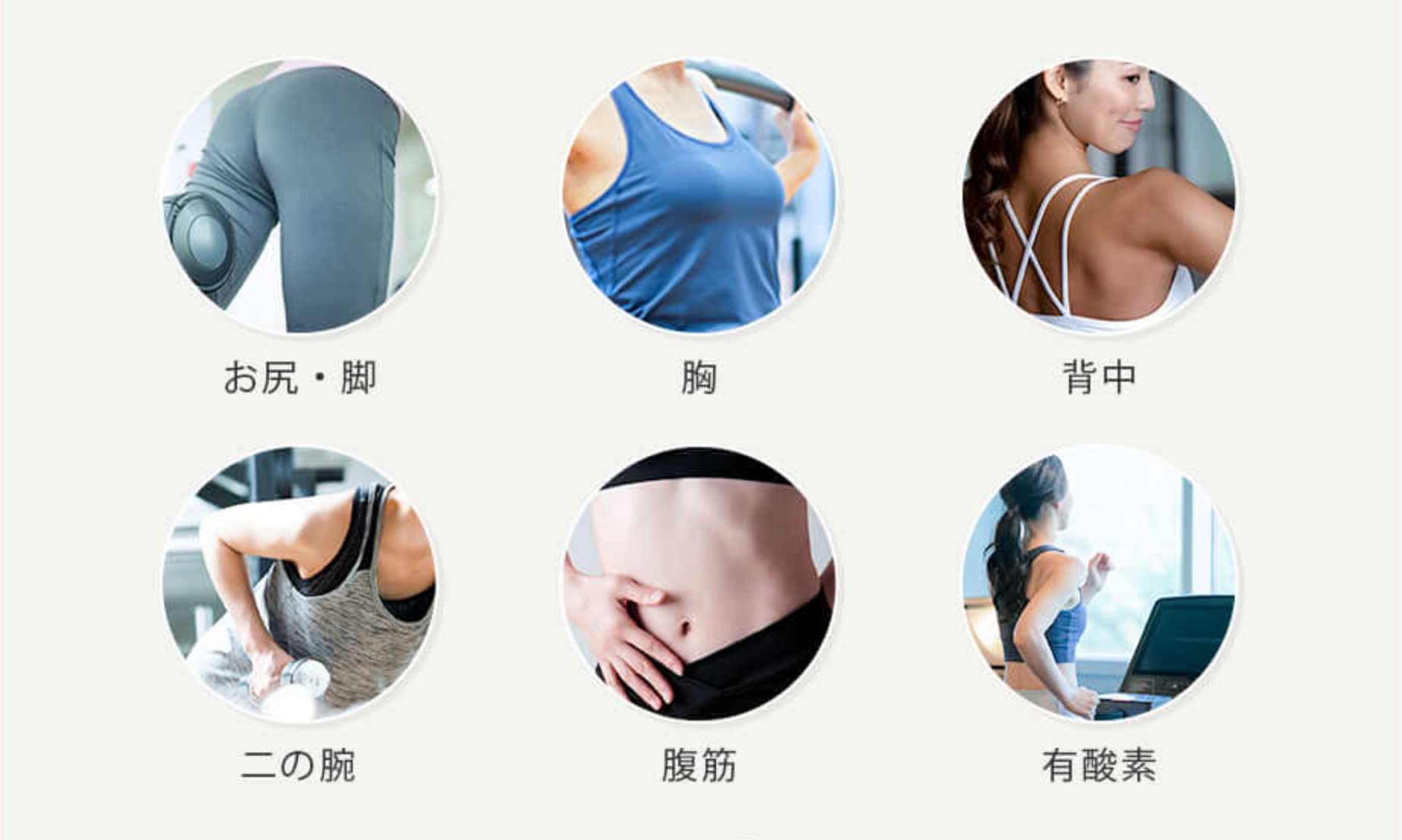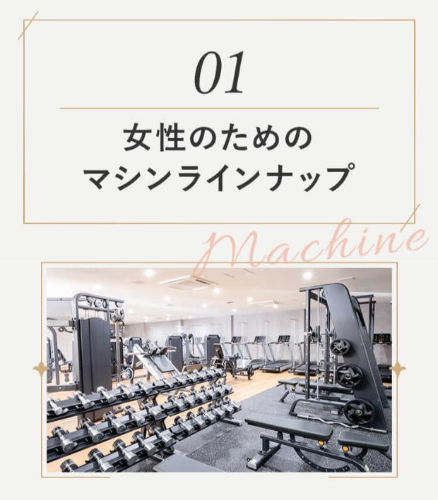 有酸素マシンはもちろん、「ヒップスラスト」「ハックスクワット」などのお尻や脚のトレーニングができる最新の女性向けのマシンを約40台以上取り揃えています。