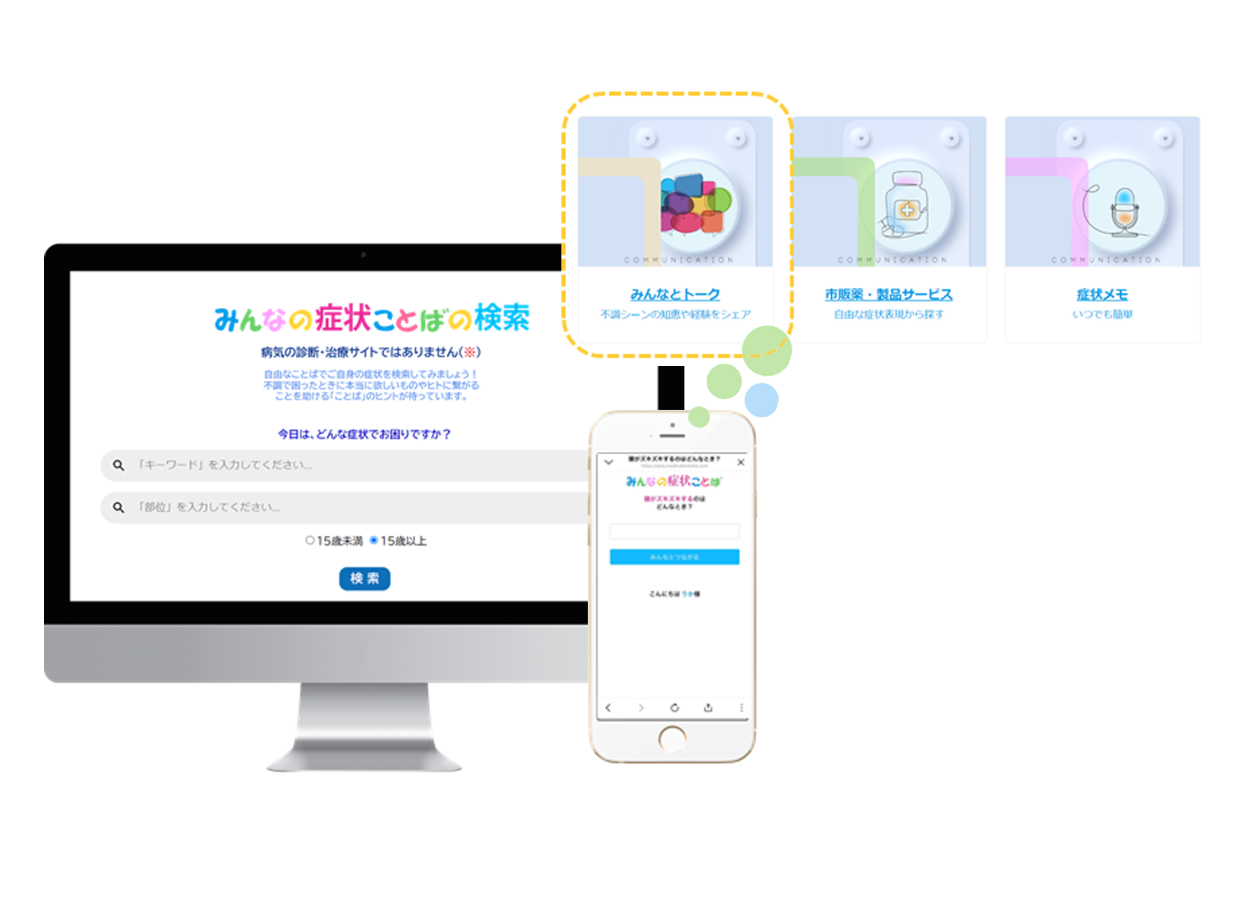 同社は個人が発した自由な症状表現をキーワードに、ユーザーがユーザー自身でより良い知恵を獲得することをサポートする「みんなの症状ことば」サービスの開発を行っています。