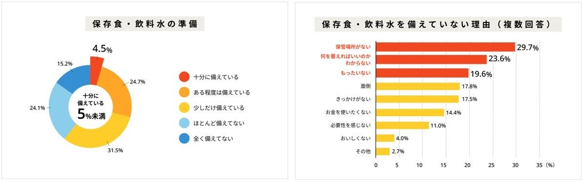 2.防災意識は高まっているものの、保存食・飲料水を「十分に備えている」人は、5%未満!備えていない理由は「保管場所がない」などのほか、知識不足という回答も!