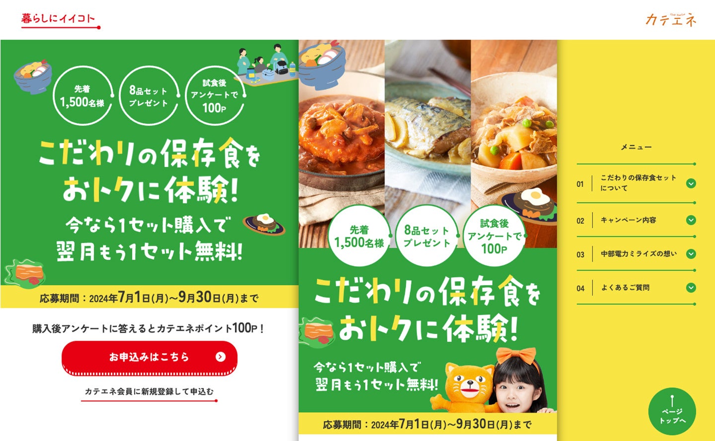この度、防災の日(9月1日)に合わせ、2024年7月1日(月)〜9月30日(月)の期間(※)、中部電力ミライズは「こだわりの保存食をおトクに体験!キャンペーン」を実施中です。該当の期間に1セット購入すると、先着で1500名様に翌月もう1セット無料でお送りいたします。