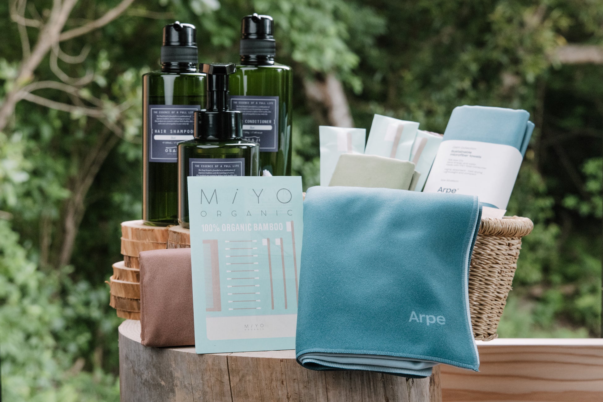 施設内のアメニティには、地球環境とヒトに配慮したエシカルなものを無理のない範囲で取り入れています。たとえば、リサイクルポリエステルを使用した環境配慮型のArpe®のバスタオルや、皮膚への影響、香りへのこだわりのあるOSAJIのソープ類など、都市生活に慣れた方も心地よく利用いただけるモノを取り揃えています。