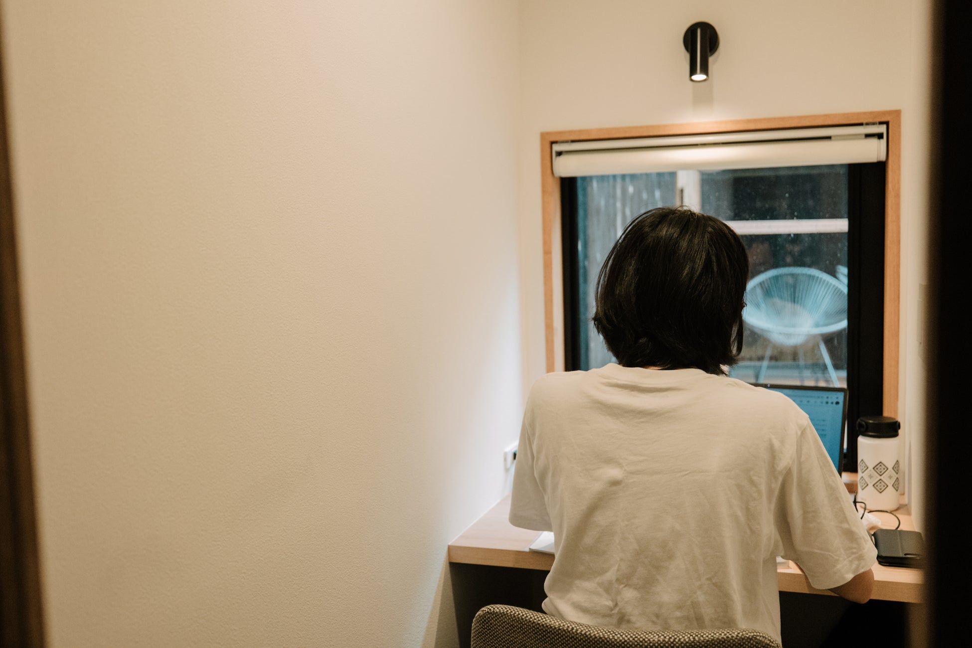 建物の棟が密接しておらず、適度な距離を保った設計となっているのも特徴です。建物のすぐそばに森や川があるので、ふらっと気分転換をしにいくのも良いかもしれません。1人でぼんやり外を眺めながら耽る時間。他の滞在者との交流を楽しむ時間。その時々に馴染む空間を楽しんでいただきたいと考えています。