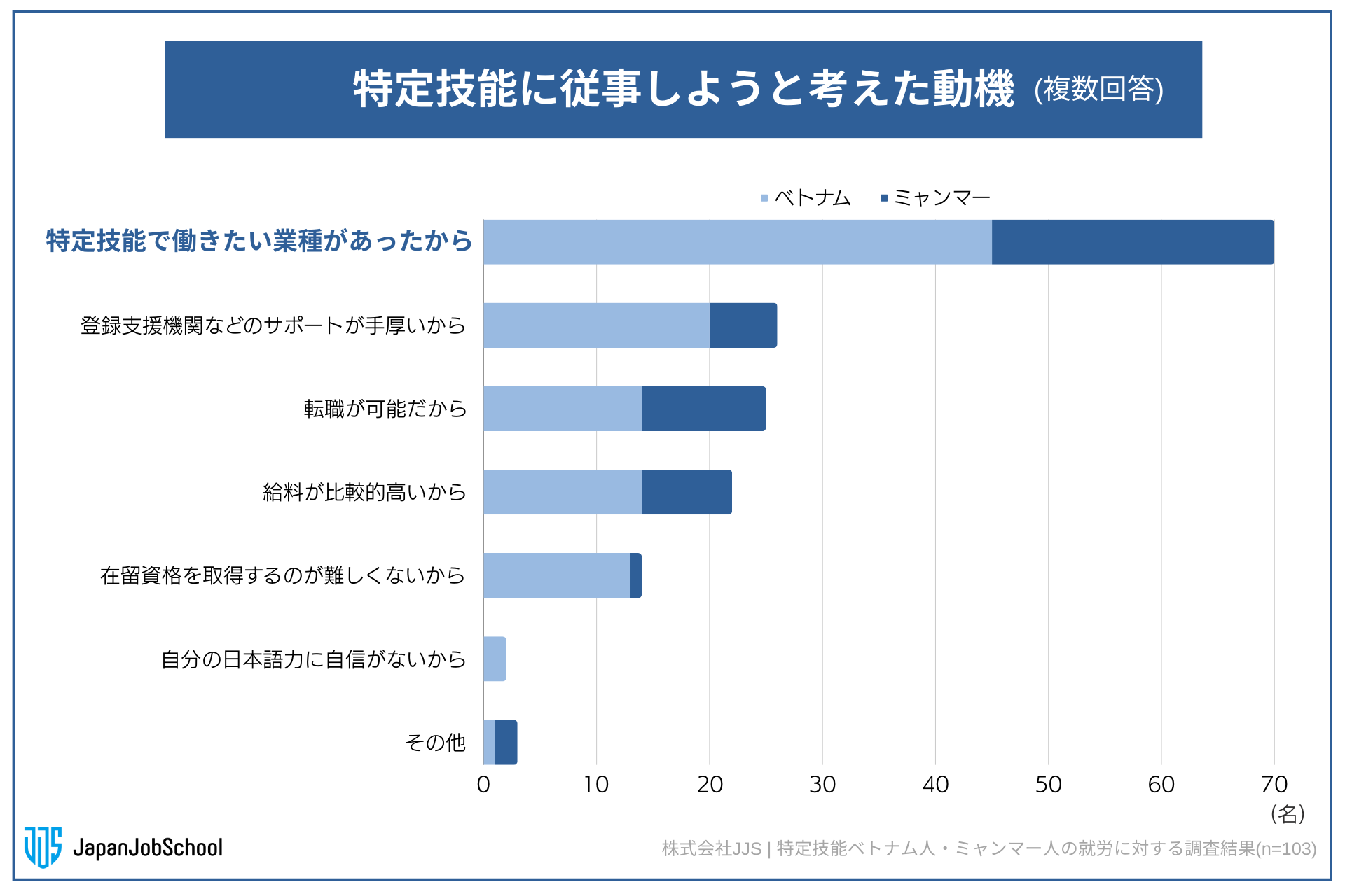 なぜ特定技能で従事しようと考えたのか質問したところ(n=103)、「特定技能で働きたい業種があったから」が最も多く70人の方が選択、次いで「登録支援機関などのサポートが手厚いから」は26名、「転職が可能だから」は25名の方が回答した。