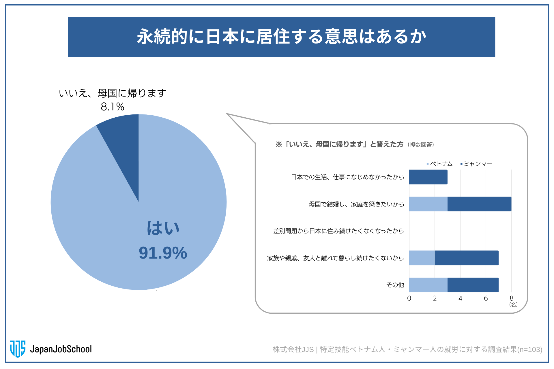 特定技能2号や介護福祉士の資格をとって日本に永続的に永住したいか質問したところ(n=103)、「はい」と答えた人は91.9%となった。